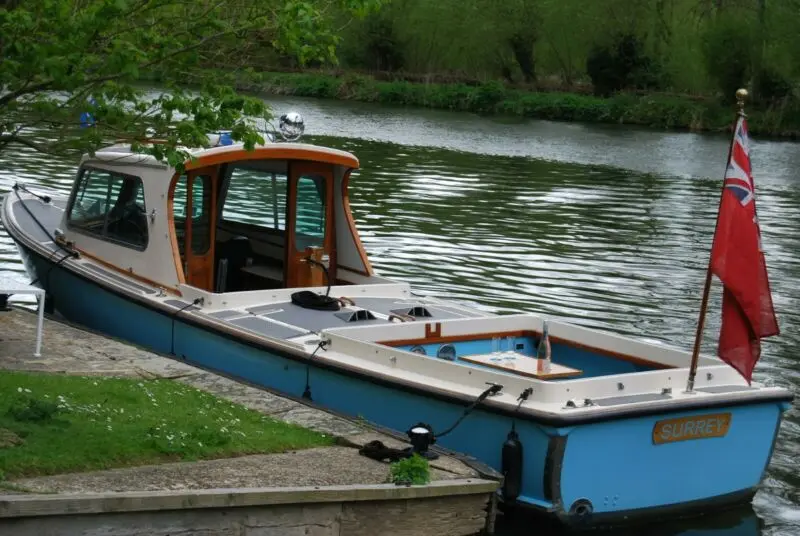 This is a rare opportunity to purchase one of the ex Thames Conservancy launches, built to a very high standard. The boat is built of fibreglass in 1973 by Robert Ives (Boat Builder) Ltd, Christchurch, Hampshire and fitted out by Thames (Ditton) Marina Ltd and refitted by R J Prior & Son (Burnham) Ltd in 1988. Painted Squall Blue with blue water line and blue antifouling, cream superstructure and cabin top, treadmaster decks and all-round fendering.