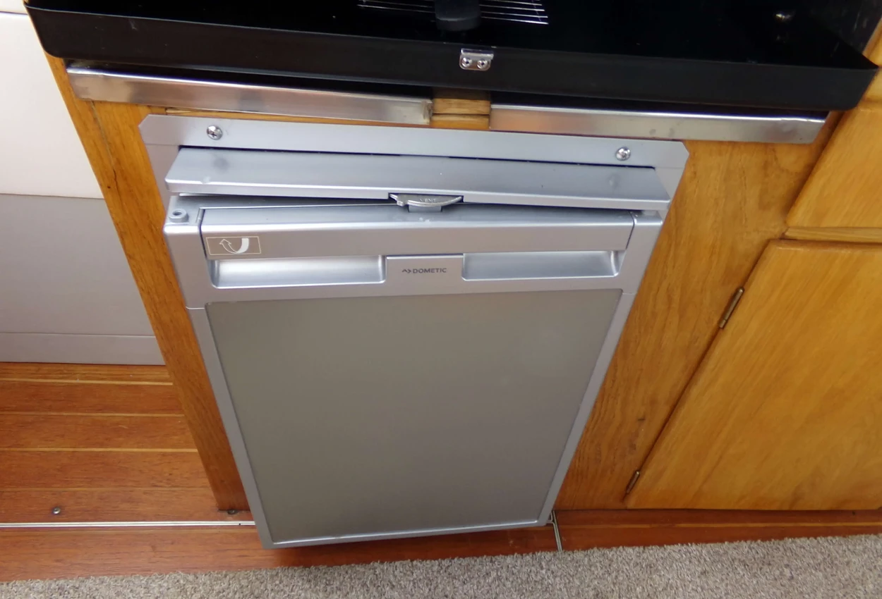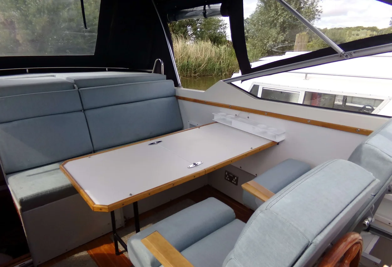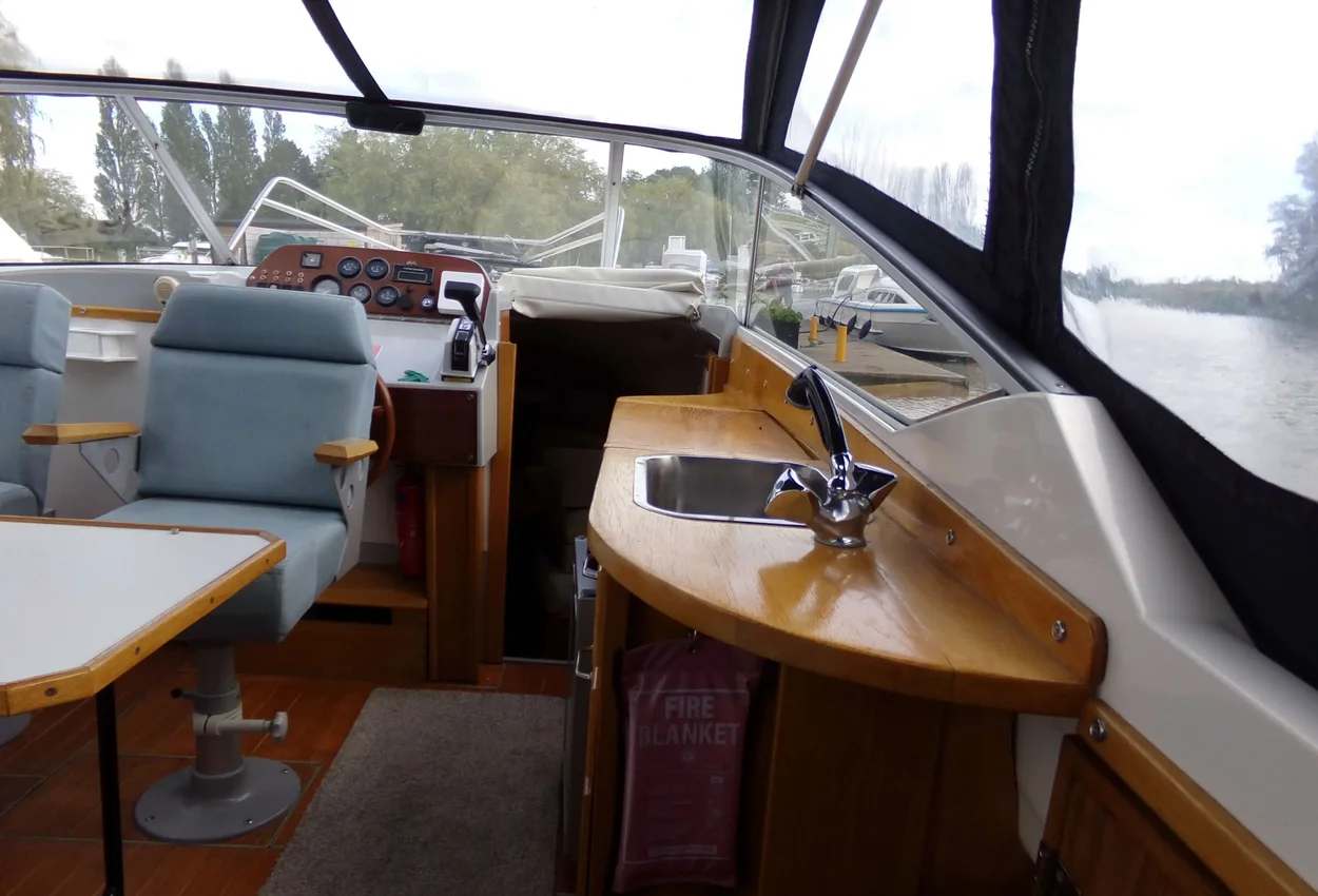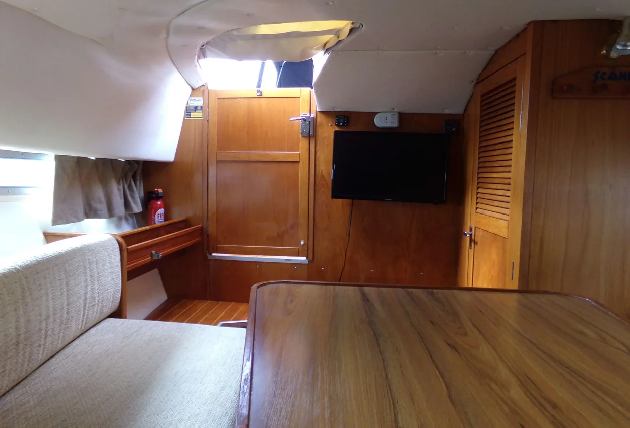 These features provide parents with separate sleeping space from children or guests. The main cabin includes a TV and DVD player, along with an enclosed toilet. The wheelhouse has a usable center helm position, with seats that fold back to create a comfortable dining area next to the galley on the starboard side.
