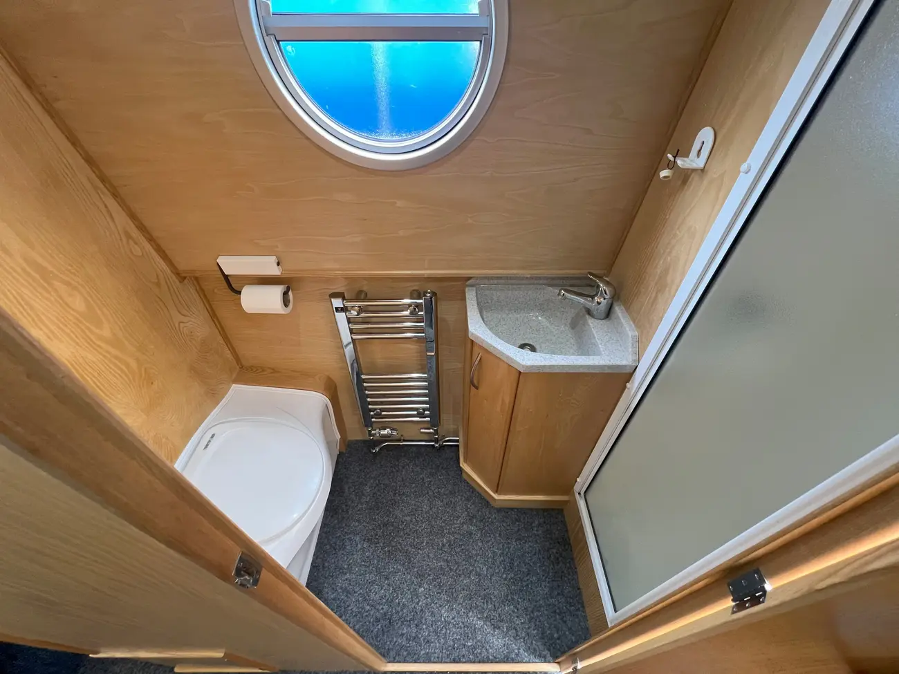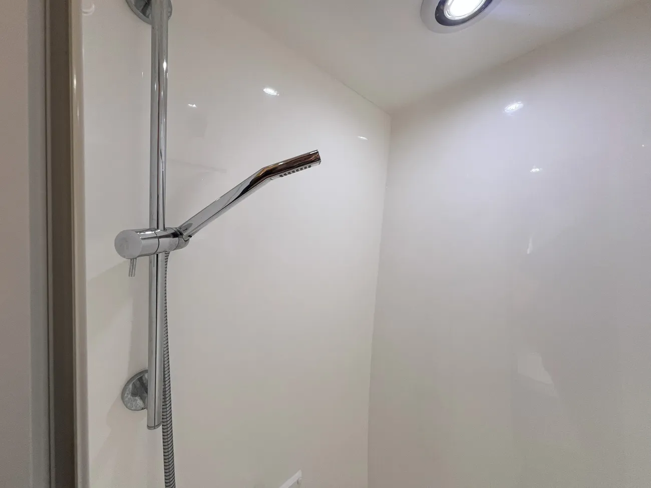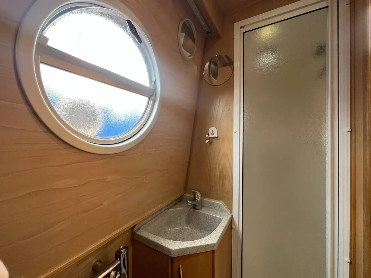 Located to starboard and thoughtfully designed to maximise space. Features include a hand basin with single-lever stainless steel mixer tap, a separate shower cubicle, Thetford cassette toilet, and a heated towel rail, providing both practicality and comfort afloat.