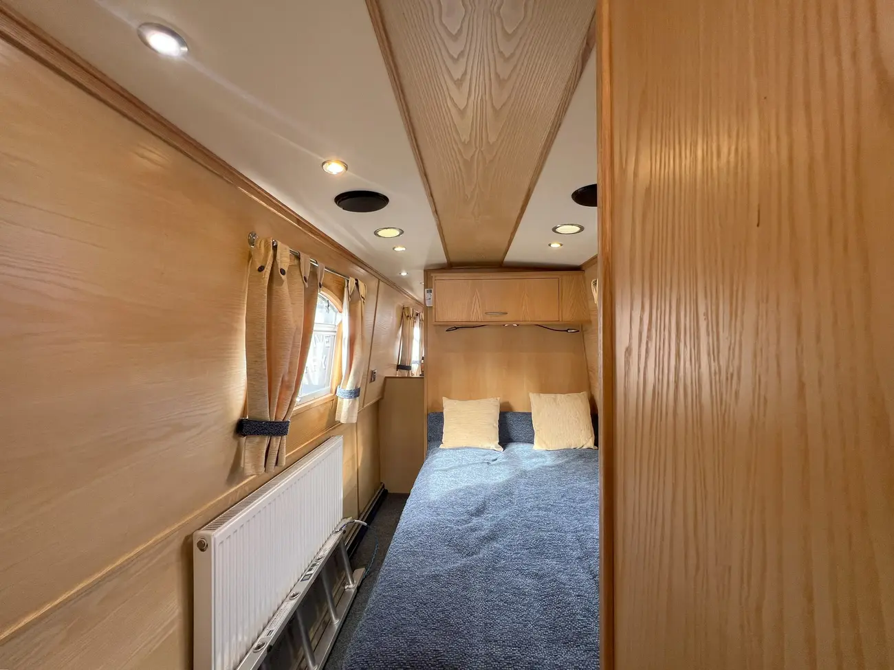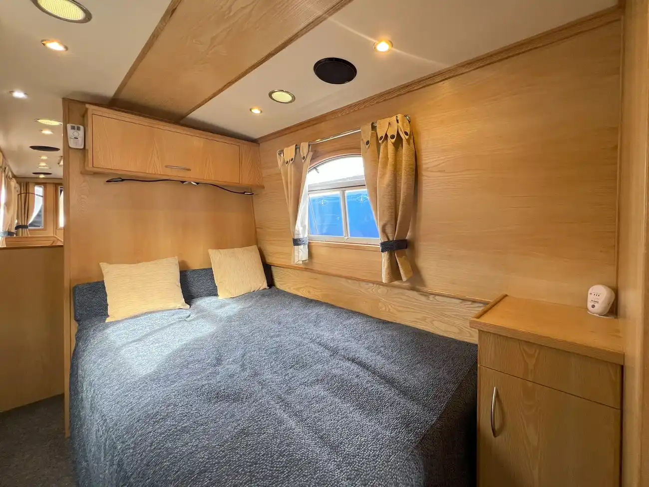 A fixed double berth with storage beneath offers excellent space efficiency, complemented by overhead cupboards fitted with LED reading spotlights. Additional storage is provided by two chests of drawers and a full-height hanging wardrobe. A 12V radio system is discreetly housed within the port-side storage unit, with speakers positioned throughout the boat for onboard entertainment.