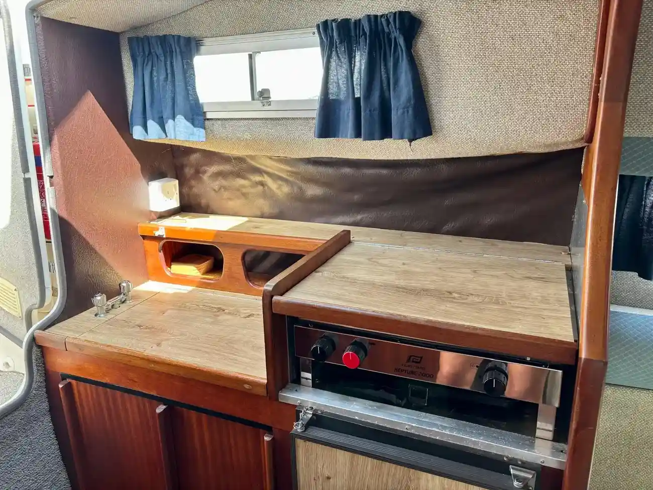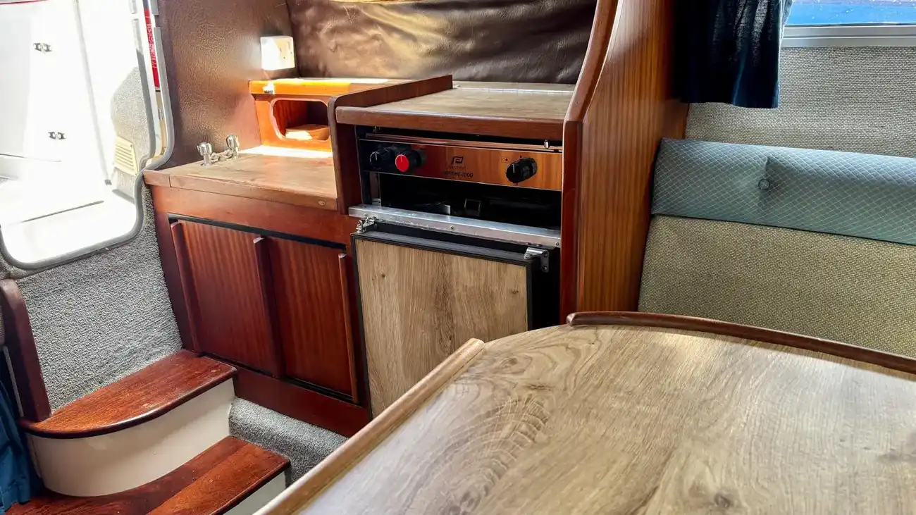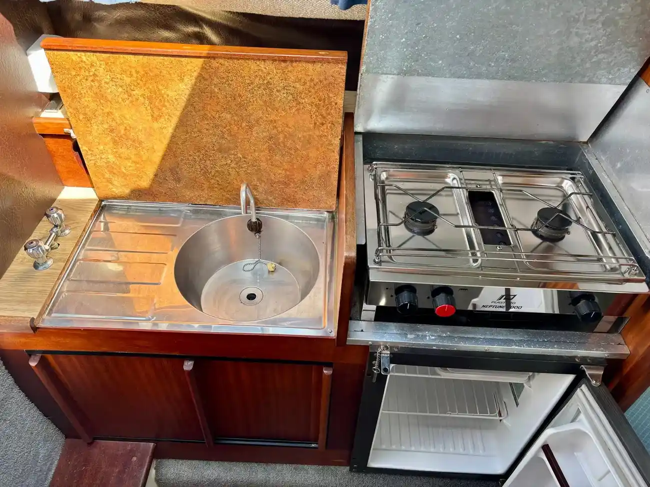 • Galley: Equipped with a 2-burner stove, grill, fridge, sink with hot/cold pressurized water & plentiful storage