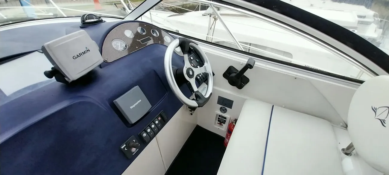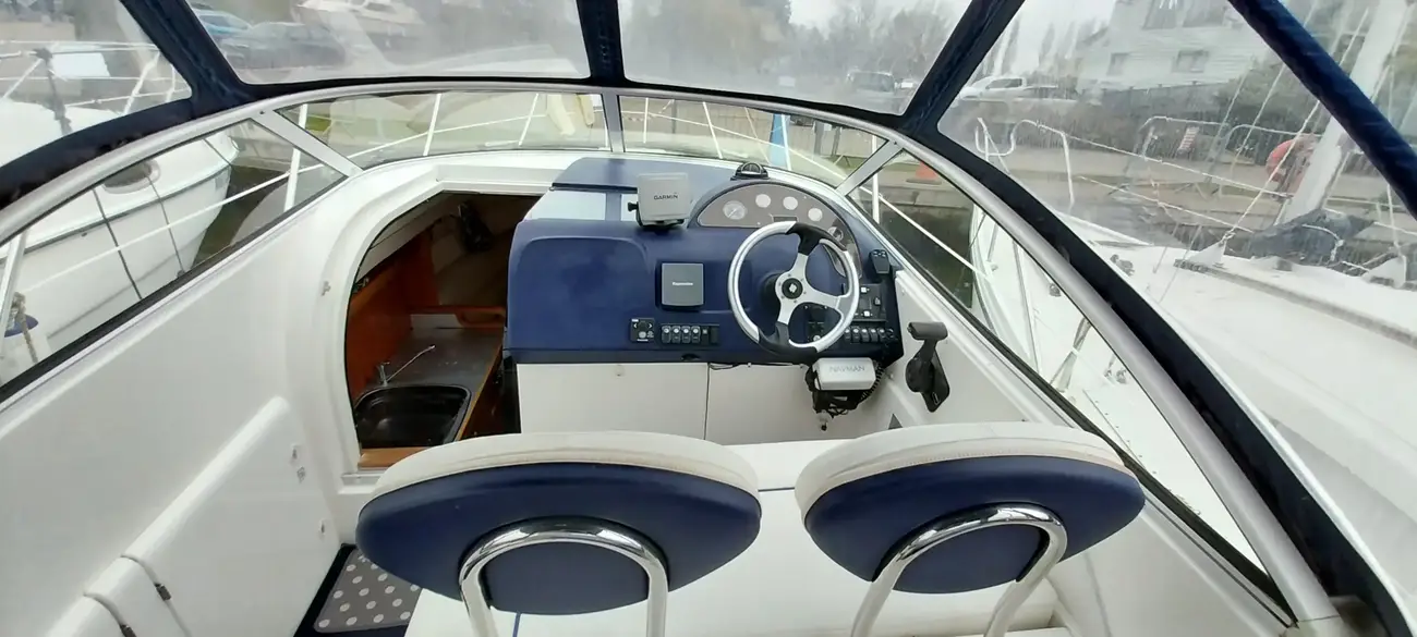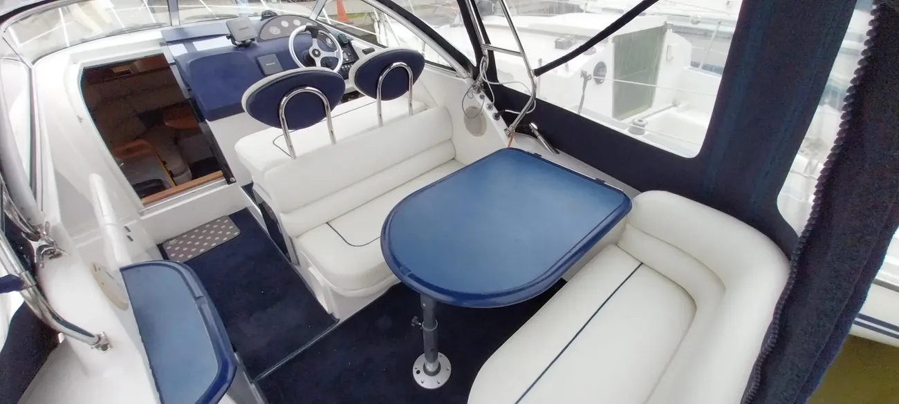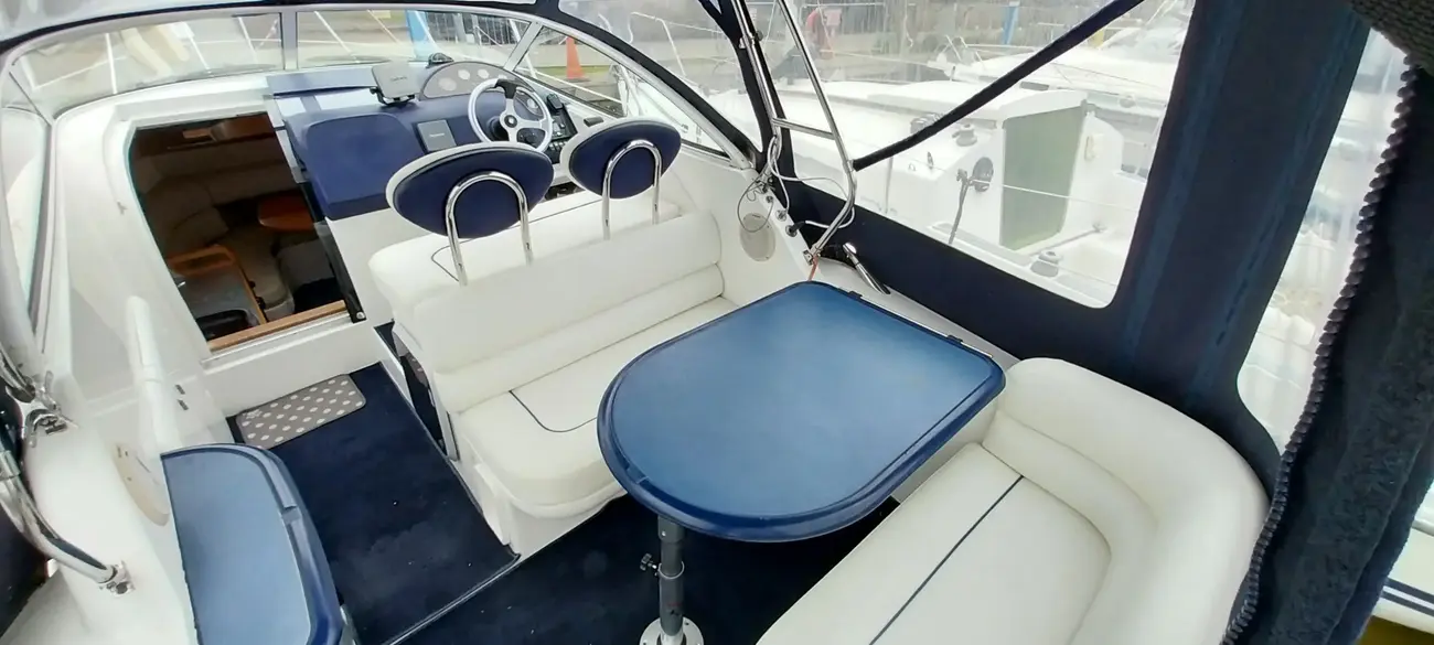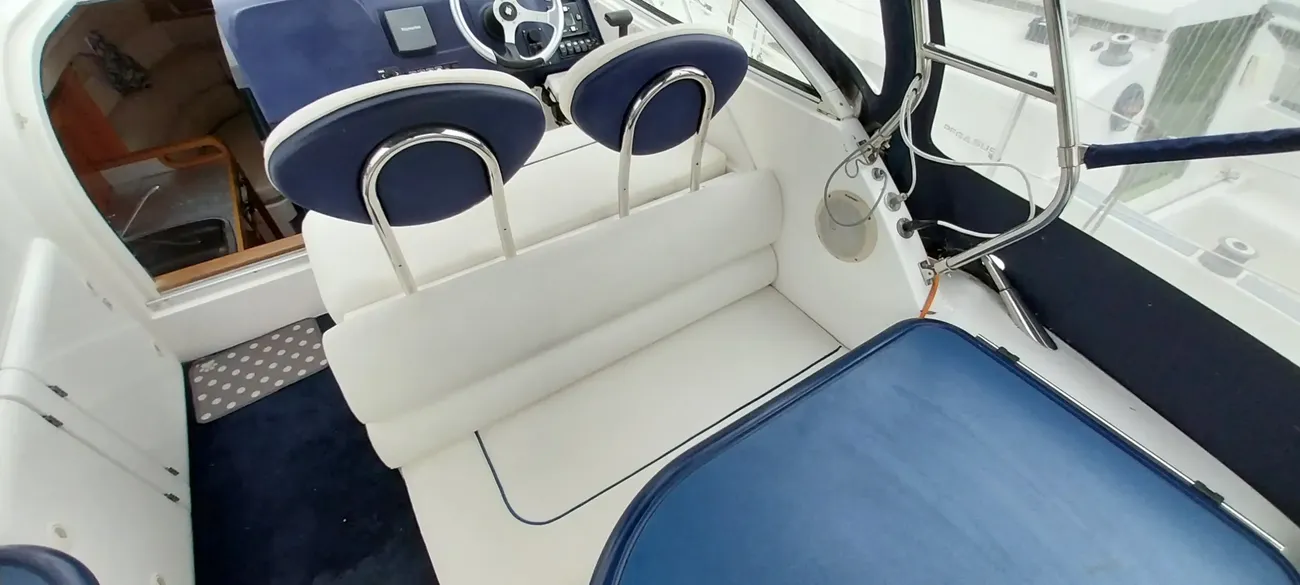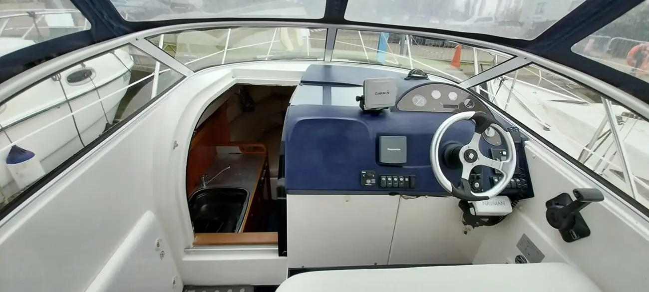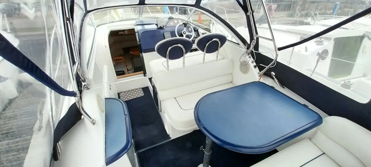2003 Sealine S23 sports cruiser - Tickety Boo. Single Volvo Penta KAD32 diesel 170hp engine. With Bow Thruster. Tickety Boo is a comfortable weekender, sleeping up to four adults. With a spacious cockpit seating including helm and navigators bench seat and two further bench seats either side if the detachable cockpit table. Small swim platform with folding boarding ladder and cockpit shower point. The canopy is in excellent condition fitted new in 2024. Clear set dials and chart table to the helm. Garmin GPS 451 Plotter, Raymarine ST60 Tridata depth/speed/trip Autohelm Series, Navman VHF Radio. New, dark blue loose fitted carpet. Fridge with ice box also in cockpit. Black perspex sliding door to saloon cabin, galley, head and aft sleeping cabin.