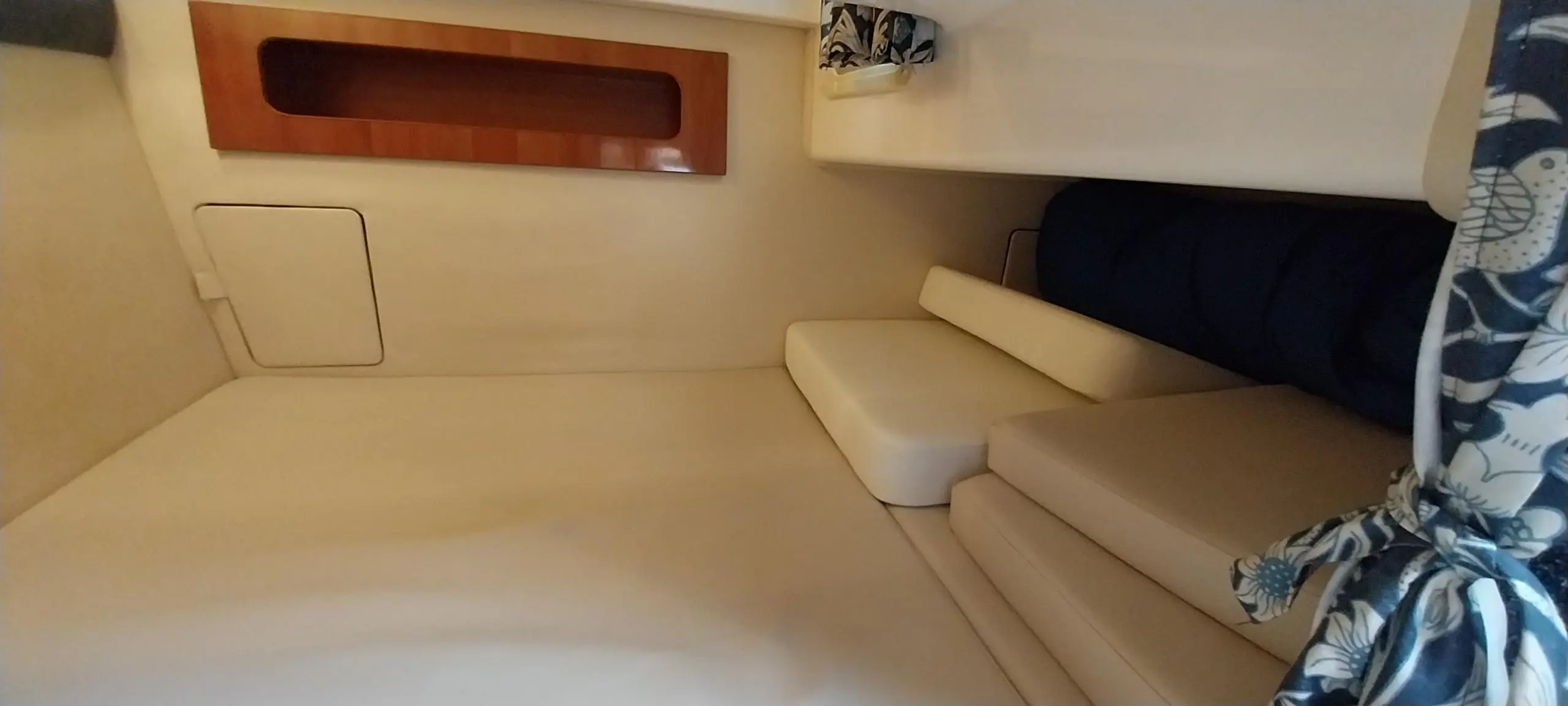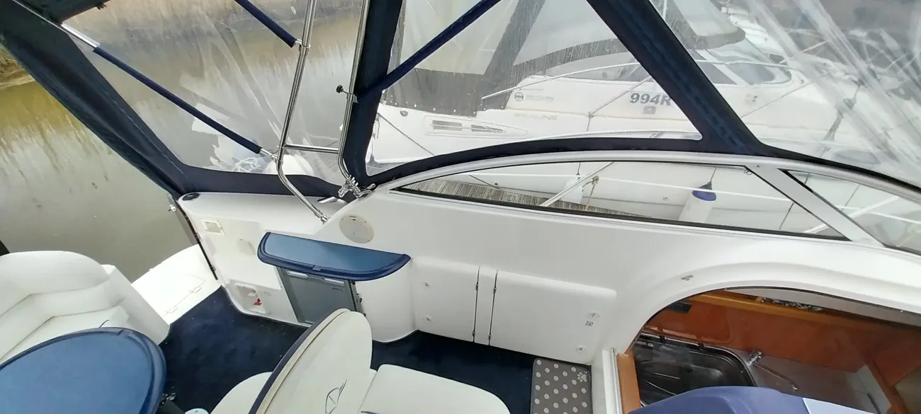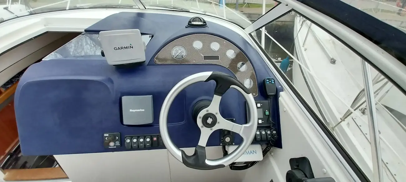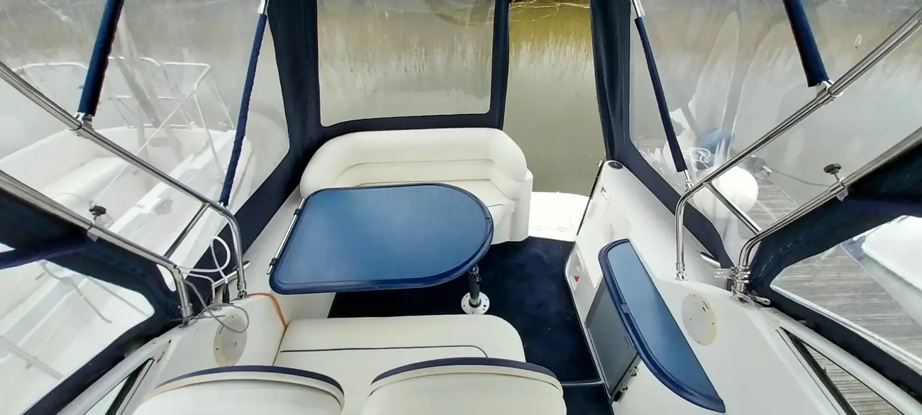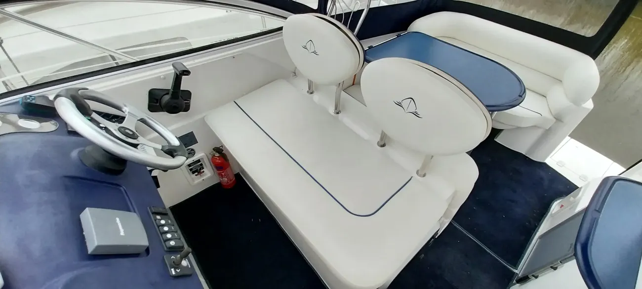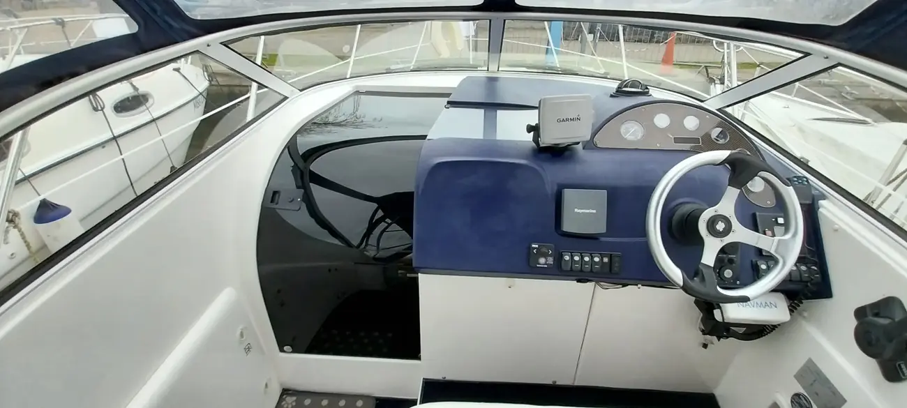 2003 Sealine S23 sports cruiser - Tickety Boo. Single Volvo Penta KAD32 diesel 170hp engine. With Bow Thruster. Tickety Boo is a comfortable weekender, sleeping up to four adults. With a spacious cockpit seating including helm and navigators bench seat and two further bench seats either side if the detachable cockpit table. Small swim platform with folding boarding ladder and cockpit shower point. The canopy is in excellent condition fitted new in 2024. Clear set dials and chart table to the helm. Garmin GPS 451 Plotter, Raymarine ST60 Tridata depth/speed/trip Autohelm Series, Navman VHF Radio. New, dark blue loose fitted carpet. Fridge with ice box also in cockpit. Black perspex sliding door to saloon cabin, galley, head and aft sleeping cabin.