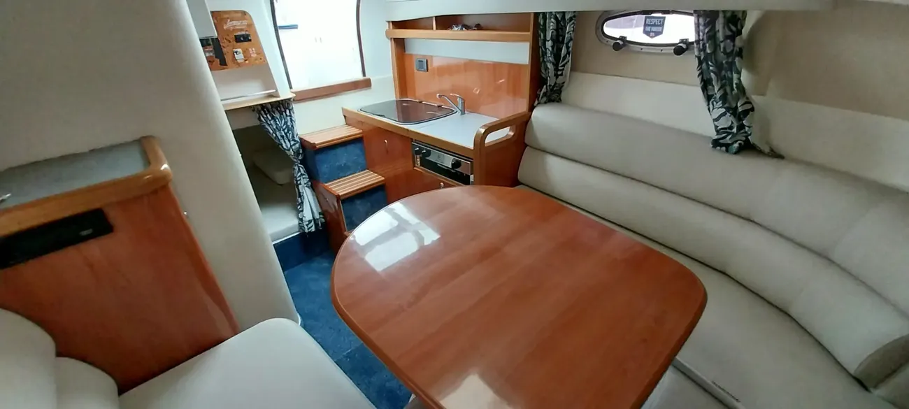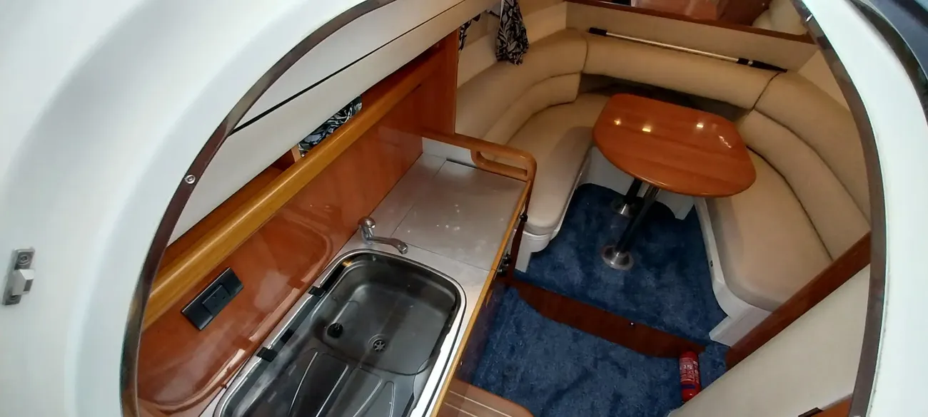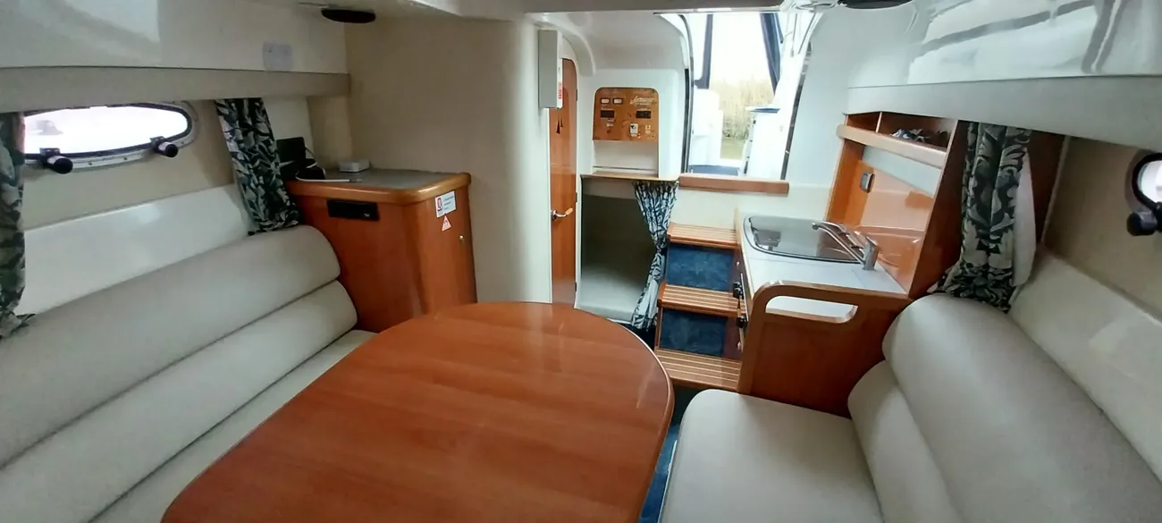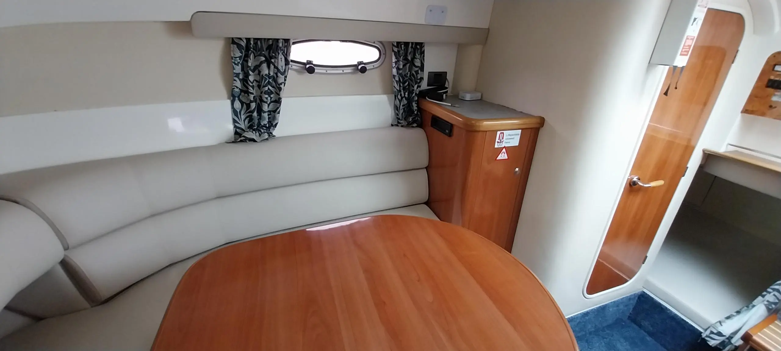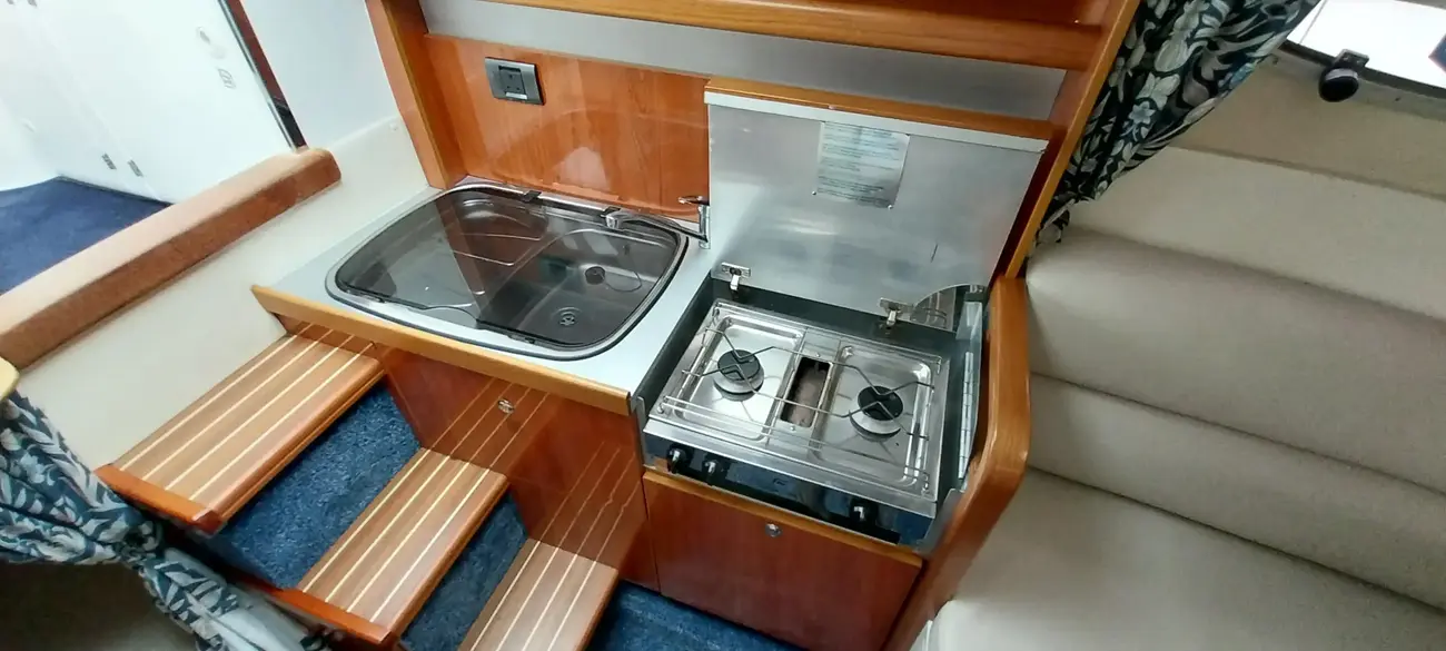 Galley has Stainless steel single drainer sink with hot and cold water, folding cover giving extra worktop space. Plastimo twin ring gas hob and grill with cover again giving extra worktop space. storage below, U shaped dinette reupholstered in 2024 and converts into a double bed. New carpet fitted throughout the saloon. Head compartment with Jabsco twist and lock manual toilet, Shower and wash basin, double cabin beneath the helm. 12V DC power and 230V AC control panel above.