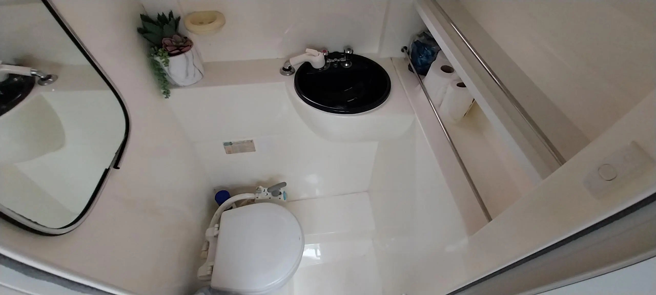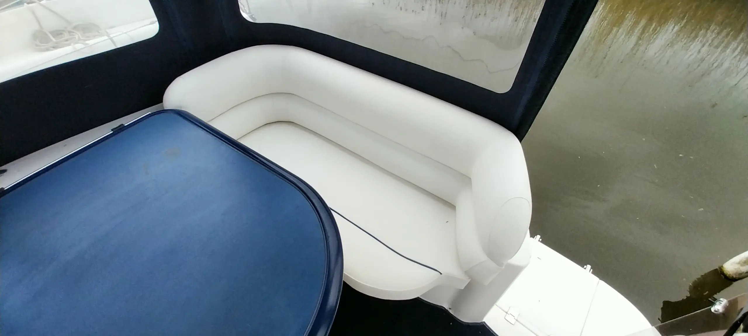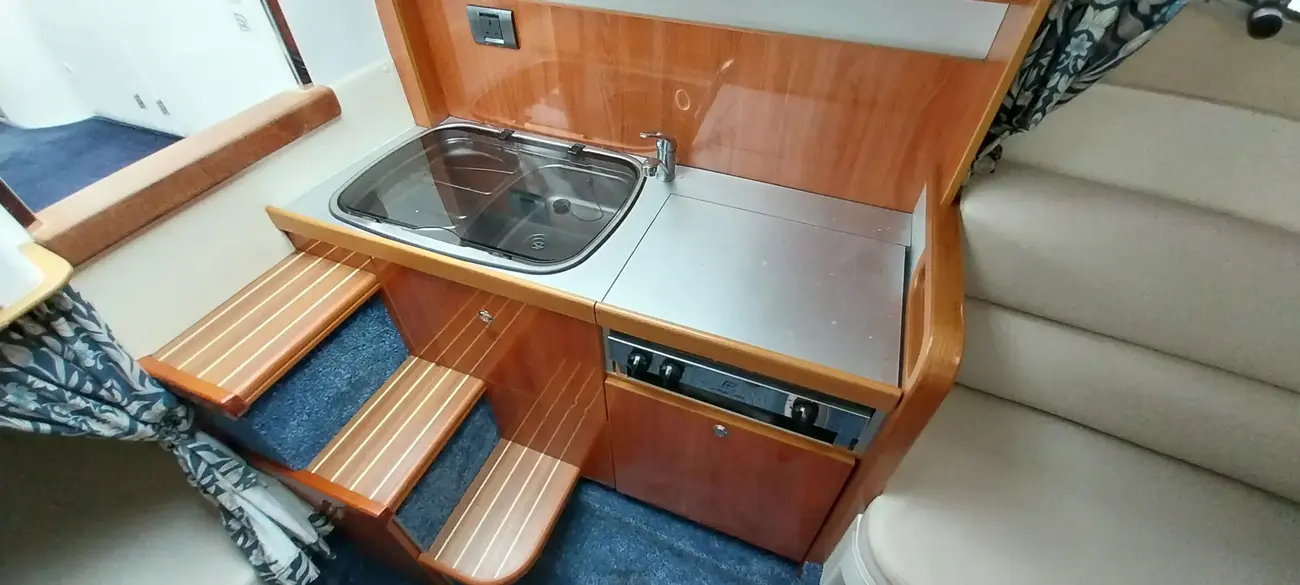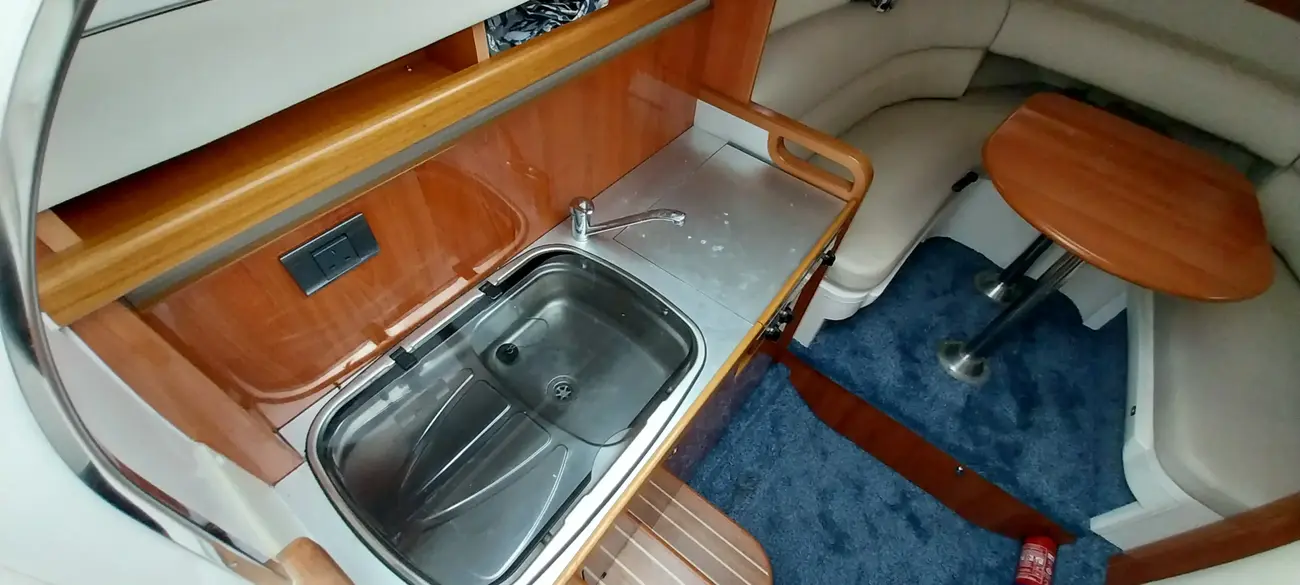 Galley has Stainless steel single drainer sink with hot and cold water, folding cover giving extra worktop space. Plastimo twin ring gas hob and grill with cover again giving extra worktop space. storage below, U shaped dinette reupholstered in 2024 and converts into a double bed. New carpet fitted throughout the saloon. Head compartment with Jabsco twist and lock manual toilet, Shower and wash basin, double cabin beneath the helm. 12V DC power and 230V AC control panel above.