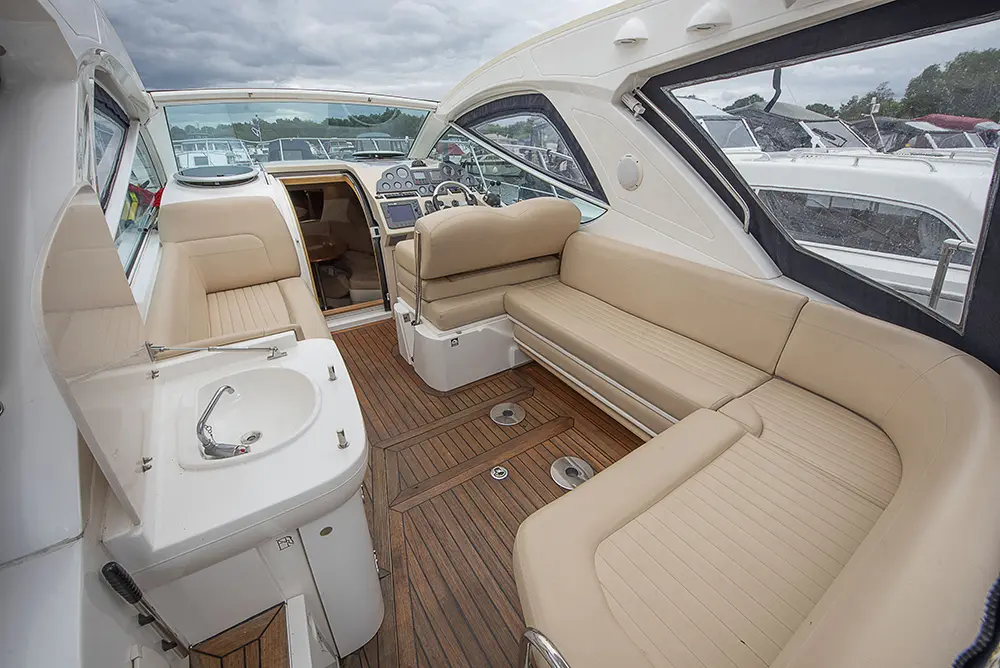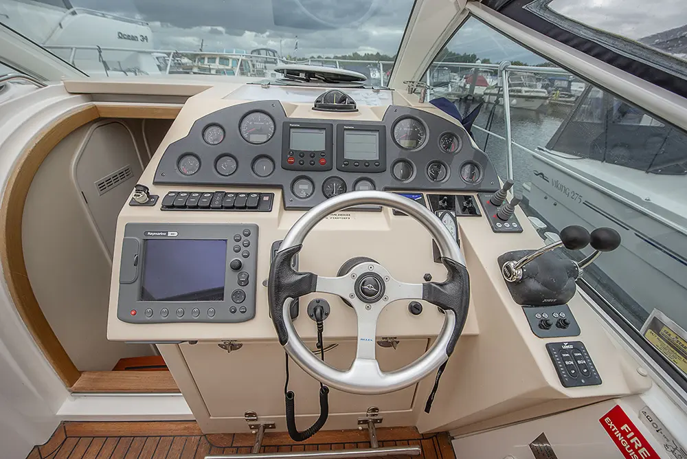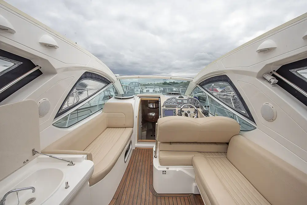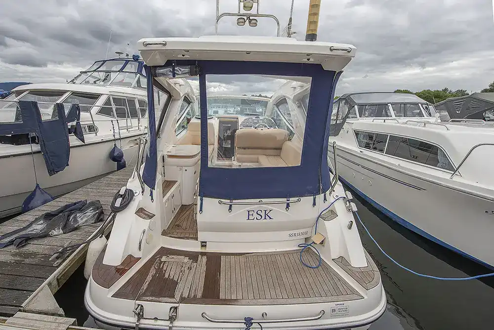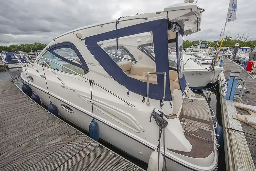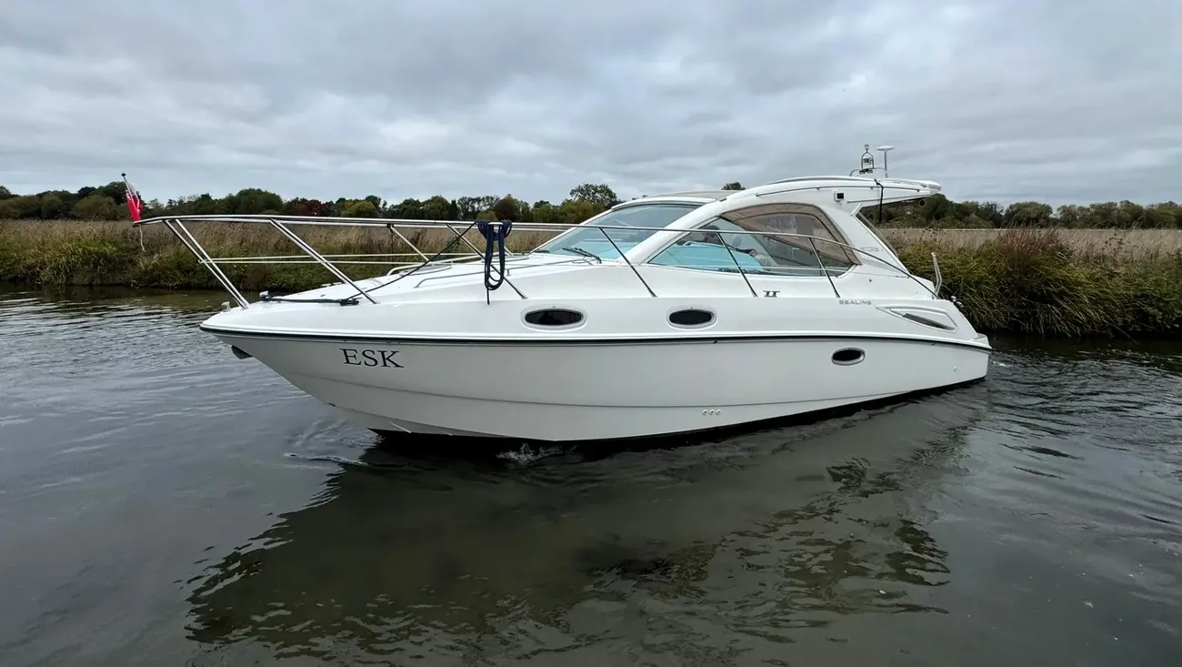 Introducing "Esk," a stunning Sealine SC29 sports cruiser that exudes elegance and performance, located in coastal waters until February 2023 and ready to become the crown jewel of your nautical adventures. This pristine vessel whispers luxury with every detail, ensuring that you and your guests experience the epitome of comfort and style afloat. Picture yourself at the helm, feeling the power of the twin Volvo D3-190 diesel engines purr beneath you as they propel "Esk" to an exhilarating top speed of approximately 30 knots. Yet equaly comfortable al onland speeds. The wind in your hair, the sun on your face, and the horizon calling – isn't that the life we all dream of? Stepping inside, you're greeted by an inviting saloon with a cozy double cabin that awaits a peaceful night's slumber. The saloon itself can be easily converted into a second sleeping area, ensuring that up to four of your nearest and dearest can share in the joy of this floating sanctuary. The heads, equipped with a modern electric toilet connected to a holding tank, are accessed through cleverly designed Jack & Jill doors, offering both convenience and privacy. The galley, a testament to practicality and beauty, boasts Corian worktops and cabinetry that gleams with a warm, welcoming sheen. Whether you're whipping up a gourmet meal or a quick snack, the two-burner gas hob and saloon fridge are at your service. And let's not forget the wet bar and fridge in the cockpit, ensuring that refreshments are never far from reach as you bask in the sun or entertain under the stars. Speaking of which, the cockpit is a marvel of social functionality. A 'C' shaped seating area with a table that morphs into a sunbed invites leisurely afternoons of laughter and conversation. The unique sliding manual roof opens wide, creating a vast, open-air space that lets the sun shine in or the stars twinkle down, depending on your mood. And when the sun is at its peak, the bow sun pad is the perfect perch for catching some rays. Navigating "Esk" is a breeze with her state-of-the-art electronics. The Raymarine C80 Chartplotter, DSC/VHF, and Plastimo Compass are your trusty companions, guiding you safely through even the most uncharted waters. And for those tricky docking maneuvers, bow and stern thrusters are on hand to make it look like you've been doing this all your life. But wait, there's more! "Esk" comes with a bevy of features that make her the envy of the marina. The LED lights cast a warm glow, setting the tone for evening soirees, while the Lenco trim tabs and pressurized hot and cold running water are just a few of the luxuries that make this boat feel like home.And when the day is done, and it's time to take a dip, the cockpit shower and swim ladder are there to welcome you back on board. After all, what's a day on the water without a refreshing plunge?Finally, to protect your investment from the elements, "Esk" comes with a stylish camper cover that not only shields her from the sun and rain but also turns heads with its sleek design.In summary, "Esk" is more than just a boat; she's a floating oasis of comfort, a seafaring sanctuary that offers the perfect blend of performance and luxury. If you're looking for a weekend retreat or a vessel to conquer the coastal cruise of your dreams, this Sealine SC29 is the one for you. Welcome aboard!