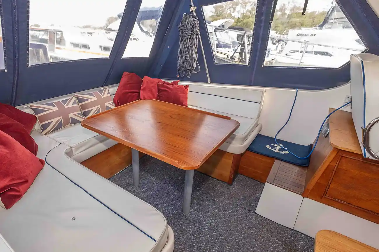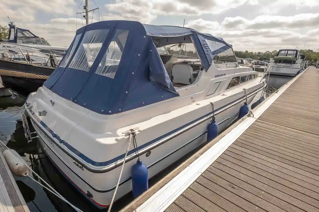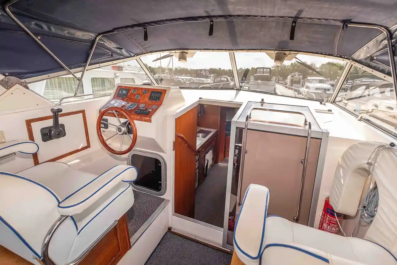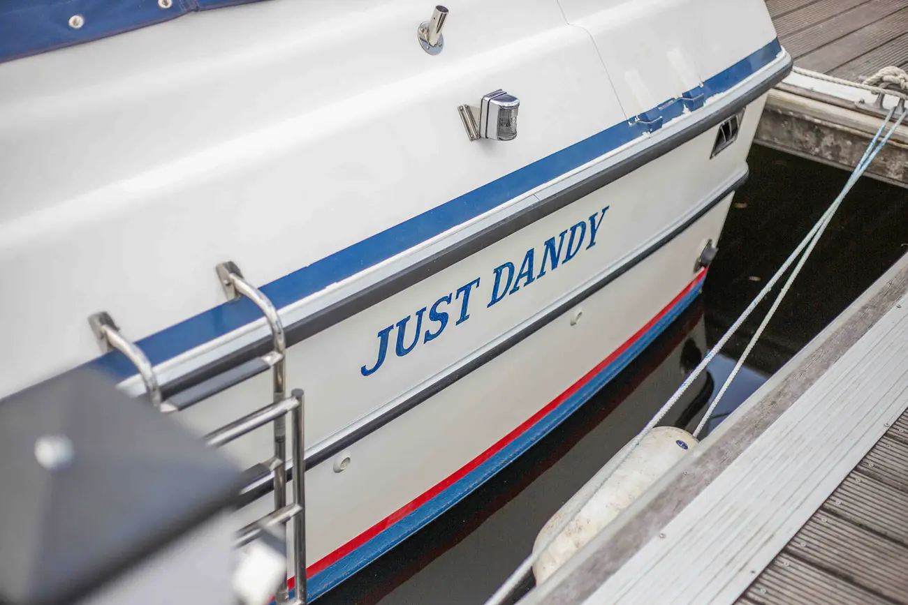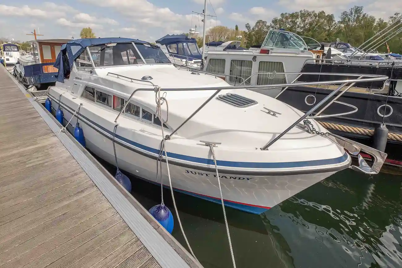 Just Dandy is a well presented example of the Sheerline 950, she is the Harmony layout featuring the large side cabin with direct shaft drive diesel, (a Nanni 62hp) Just Dandy is in superb order throughout. The Dinette opposite the galley makes into a double berth and the V Beds in the forward cabin easily accessible for 2 people, an infill makes this cabin feature a large double berth. The boat features a spacious galley and larger for a 31' craft toilet and shower compartment. The Sheerline 950 is renown for its comfortable cockpit which can seat 8 in comfort and has two easily accessible side entrances to port and starboard. The canopy is in 2 sections with a foldable GRP mast enabling the vessel to navigate the lowest of bridges with an air height of just over 7'. Just Dandy has been known by our Brokers at Thames & Kennet as she was supplied new buy Guy in 1997.