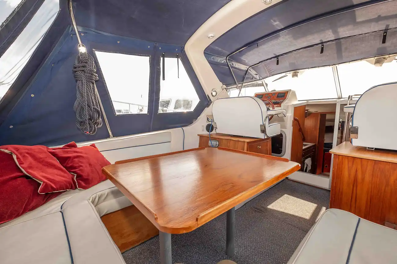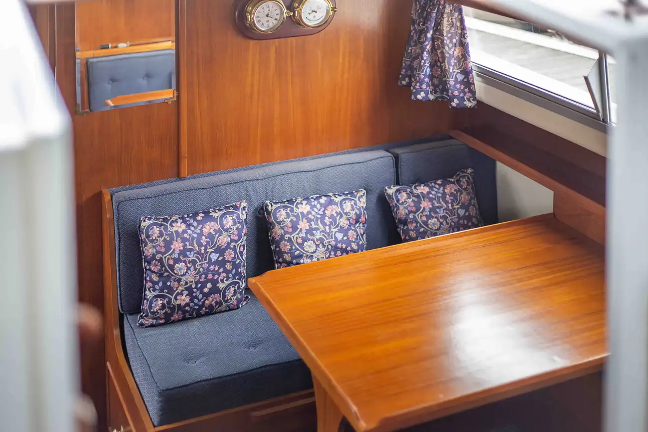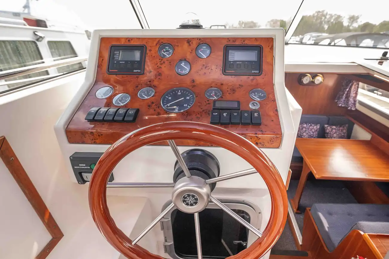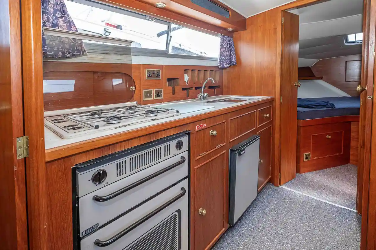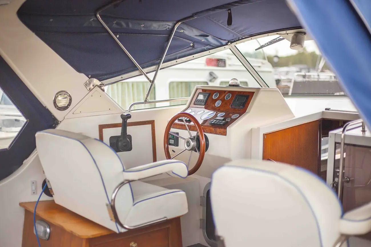 Just Dandy is a well presented example of the Sheerline 950, she is the Harmony layout featuring the large side cabin with direct shaft drive diesel, (a Nanni 62hp) Just Dandy is in superb order throughout. The Dinette opposite the galley makes into a double berth and the V Beds in the forward cabin easily accessible for 2 people, an infill makes this cabin feature a large double berth. The boat features a spacious galley and larger for a 31' craft toilet and shower compartment. The Sheerline 950 is renown for its comfortable cockpit which can seat 8 in comfort and has two easily accessible side entrances to port and starboard. The canopy is in 2 sections with a foldable GRP mast enabling the vessel to navigate the lowest of bridges with an air height of just over 7'. Just Dandy has been known by our Brokers at Thames & Kennet as she was supplied new buy Guy in 1997.