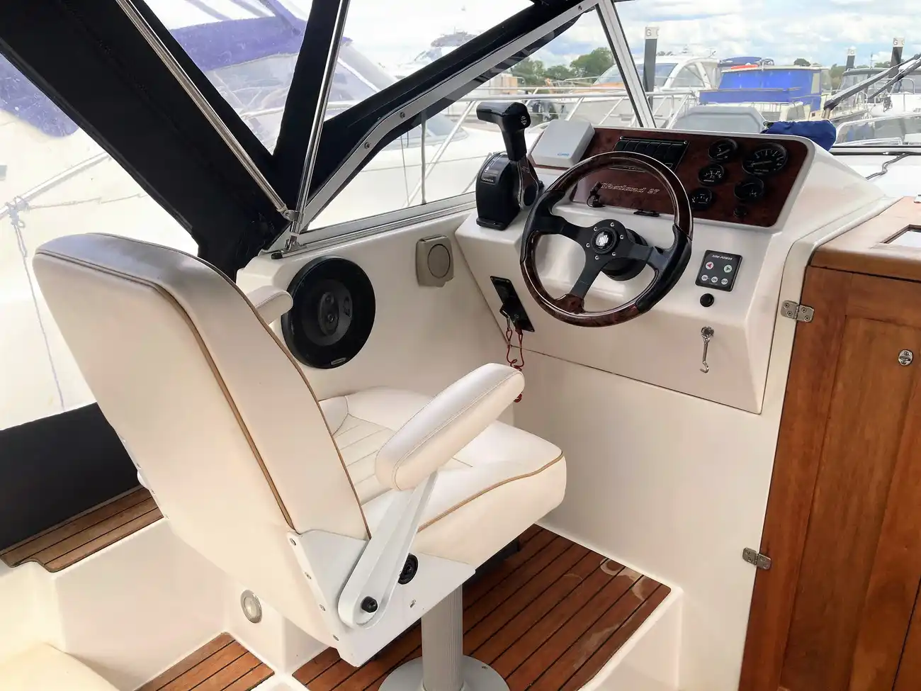 Just Pearl is a a well presented example of the Shetland 27, powered by an Honda BF50LRTU Petrol Outboard newly serviced prior to marketing. The boat is currently ashore following a full structural survey which is available to view at a visit and reassignable at completion of a purchase. The Shetland 27 offers a spacious interior with accommodation for 6 in 3 areas of the cabin. A bow thruster is fitted to aid manoeuvrability. The cockpit offers comfortable seating for 5 and is covered with a full canopy. The boat is fitted with a 2KVA inverter , a solar panel and 3 120 AH batteries. A Boat safety scheme is valid until May 2027.