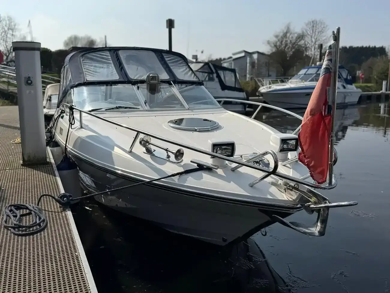 2x Spotlights, Stainless steel anchor, Electric windlass, Stainless steel pulpit rails and grab handles, Fenders, Warps and Sun deck lounger fitted cushion, protection cushion for rear transom woodwork. Bathing platform with boarding ladder.