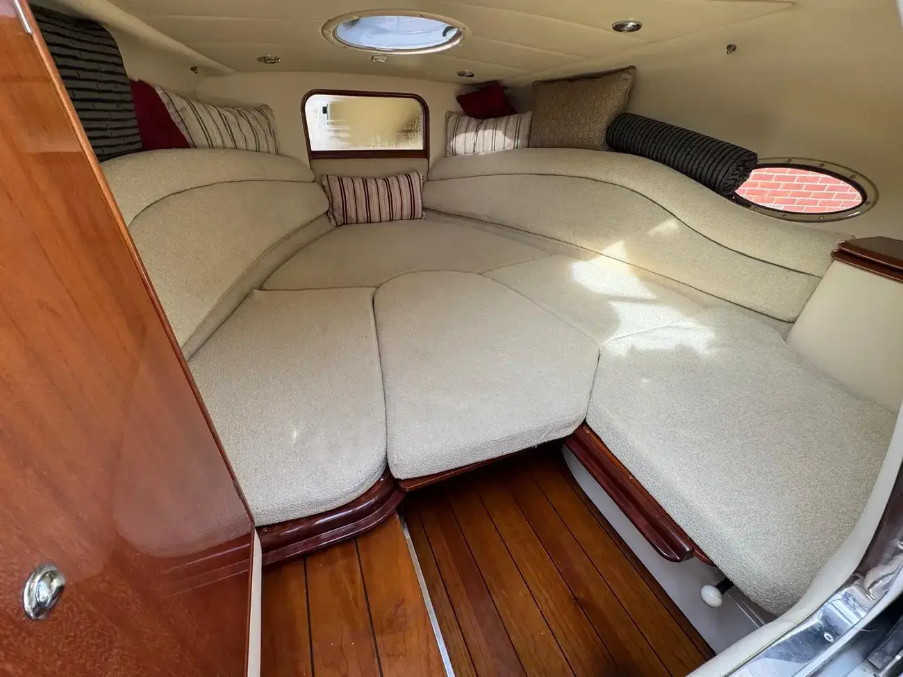 The large wrap around, stainless steel windscreen provides excellent protection as well as looking incredibly classy. The windscreen also has a central door providing access to the bow. A fitted bow cushion is included.
