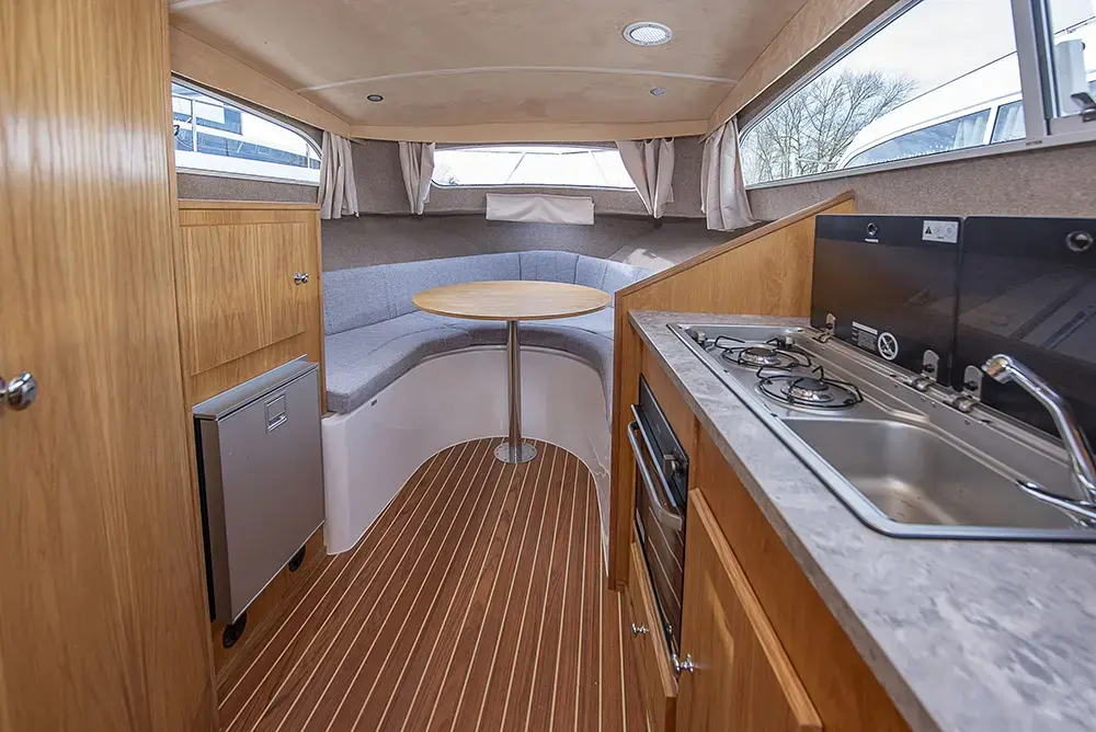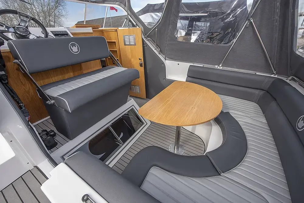 The cockpit features the helm to port with steering via a cable to the outboard, single lever engine controls, and ancillary switches. A double helm seat with storage below is to port, with further seating aft in a "U" shape design offering the flexibility to convert to a sun bed or further double berth fitted with a centrally located table. Access to the port and starboard decks is via a step beneath the seat cushion. The gas, fuel, and battery lockers are located beneath the rear seat.
