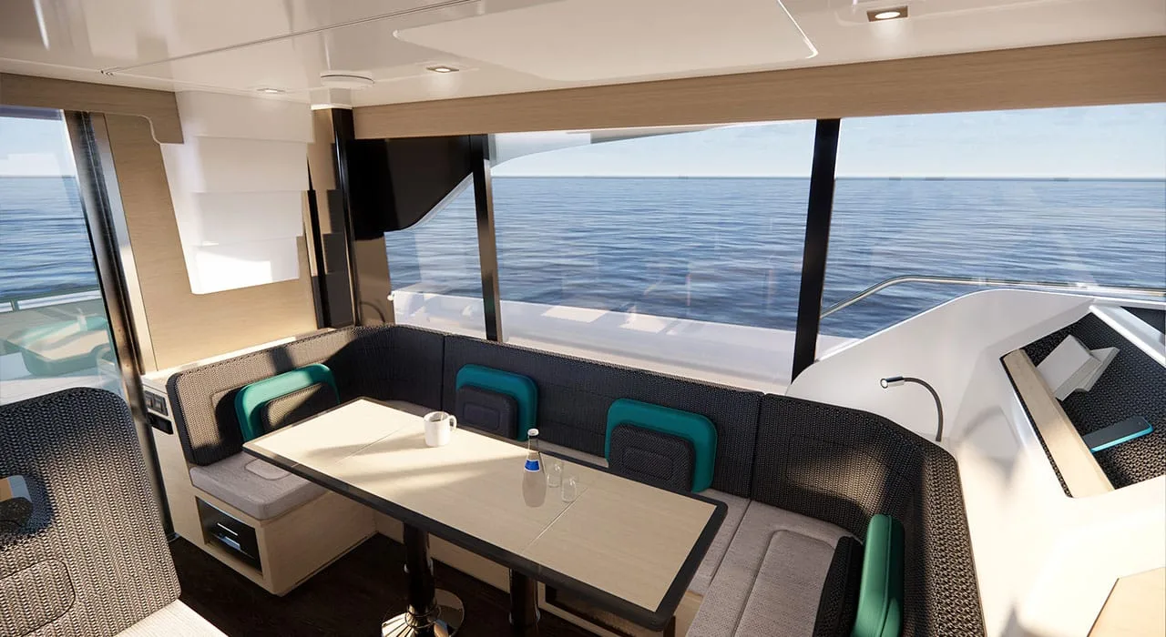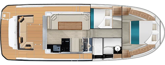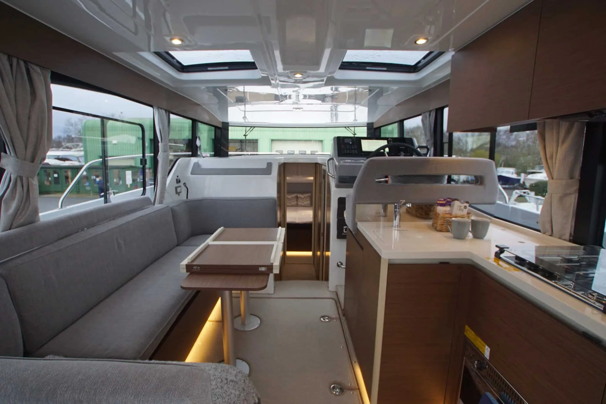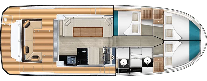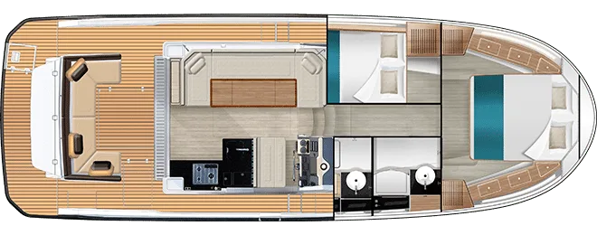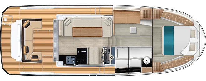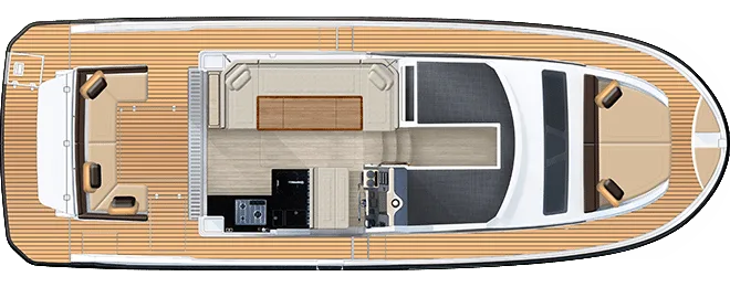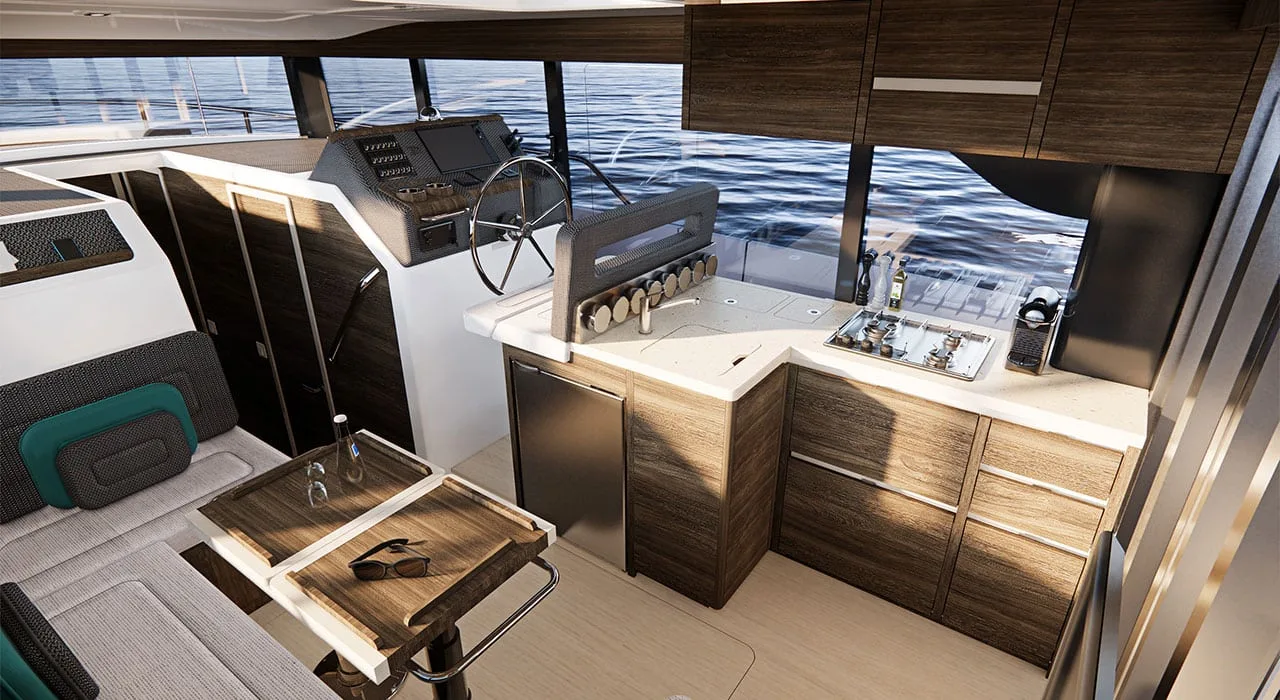 Choose to steer from the interior or exterior helm station and enjoy the well-designed, comfortable cockpit, perfect for entertaining.