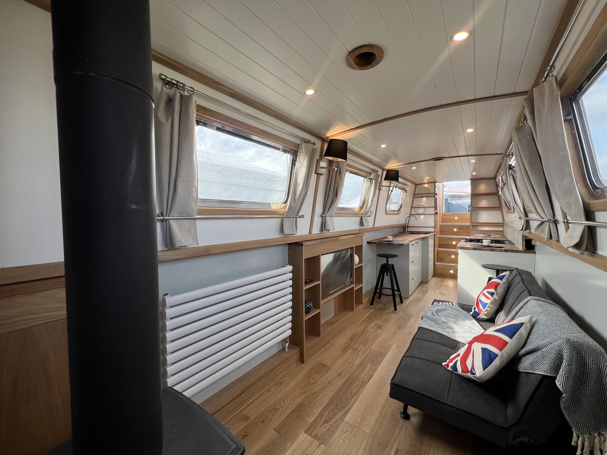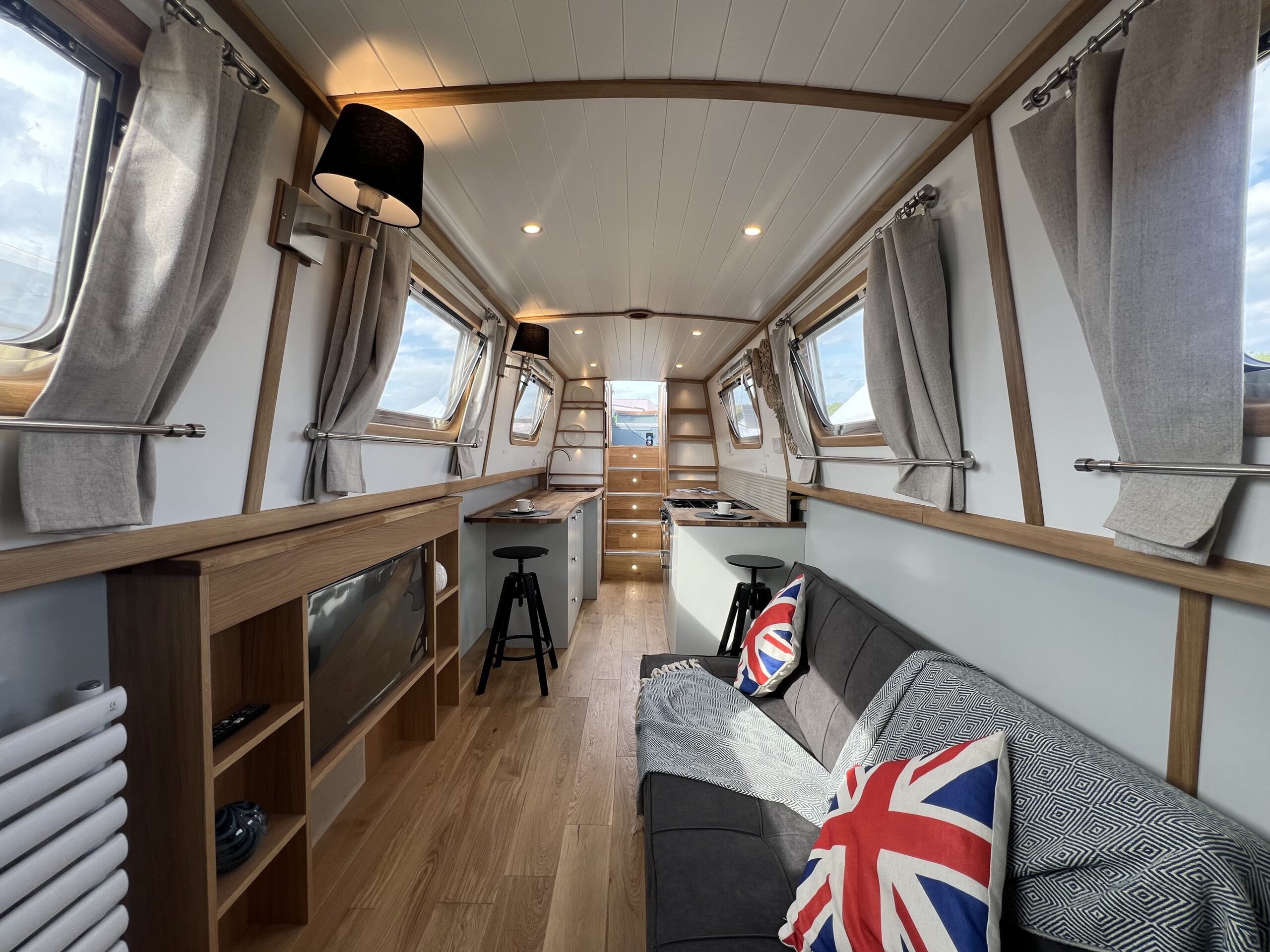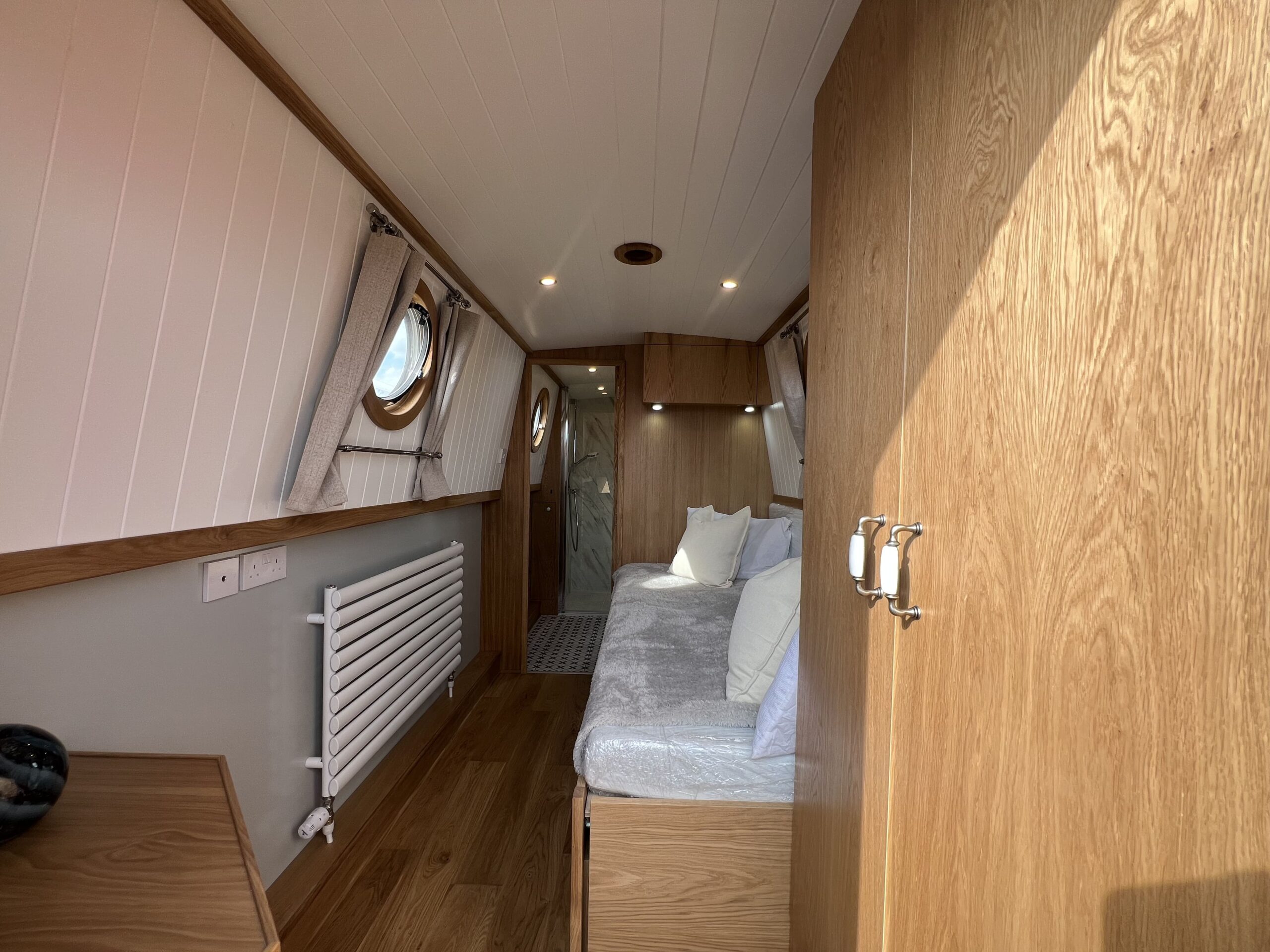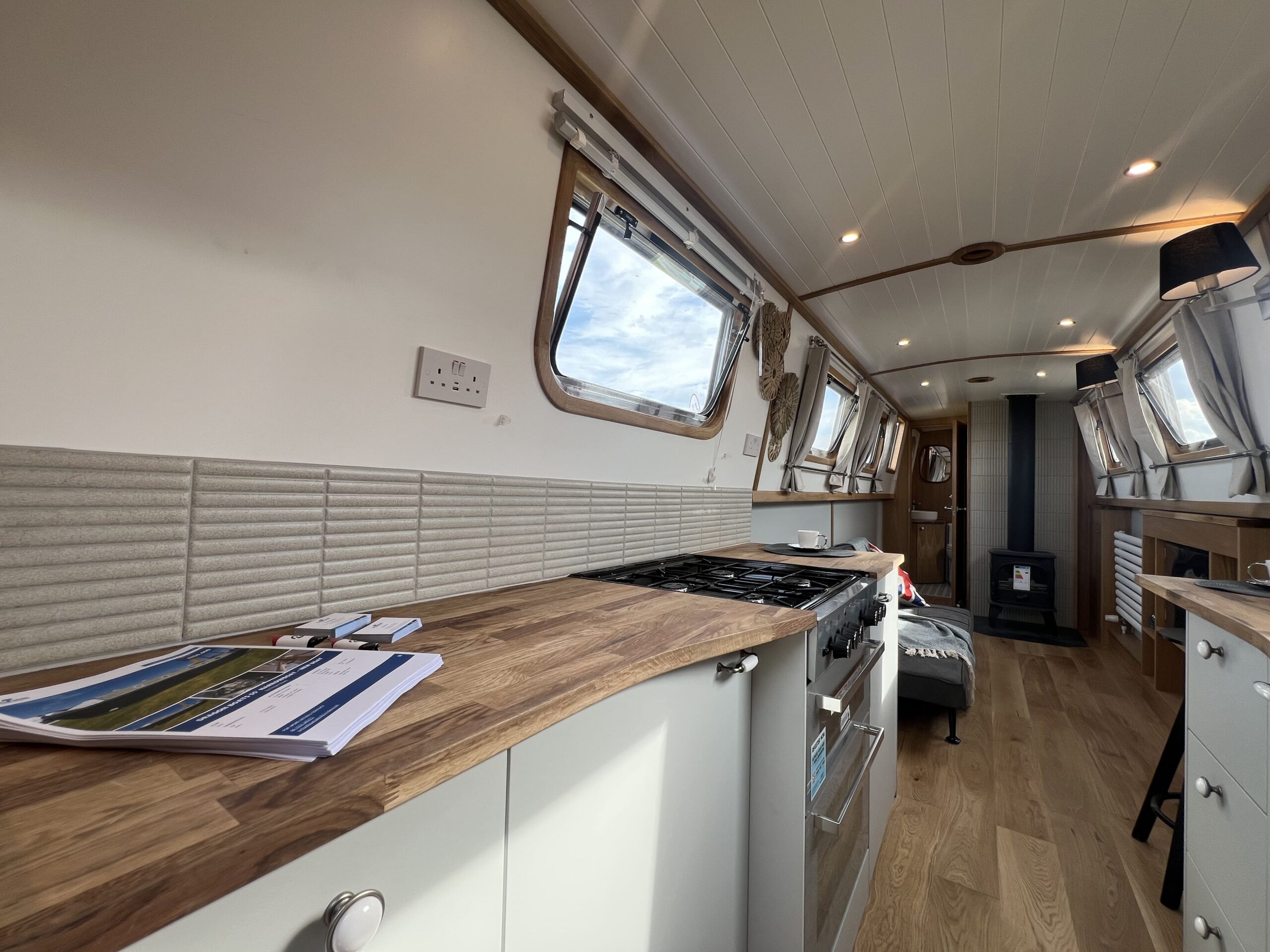 Forward, the ensuite bedroom offers restful nights on the cut, with a Hansgrohe shower and Thetford toilet adding hotel-style convenience.