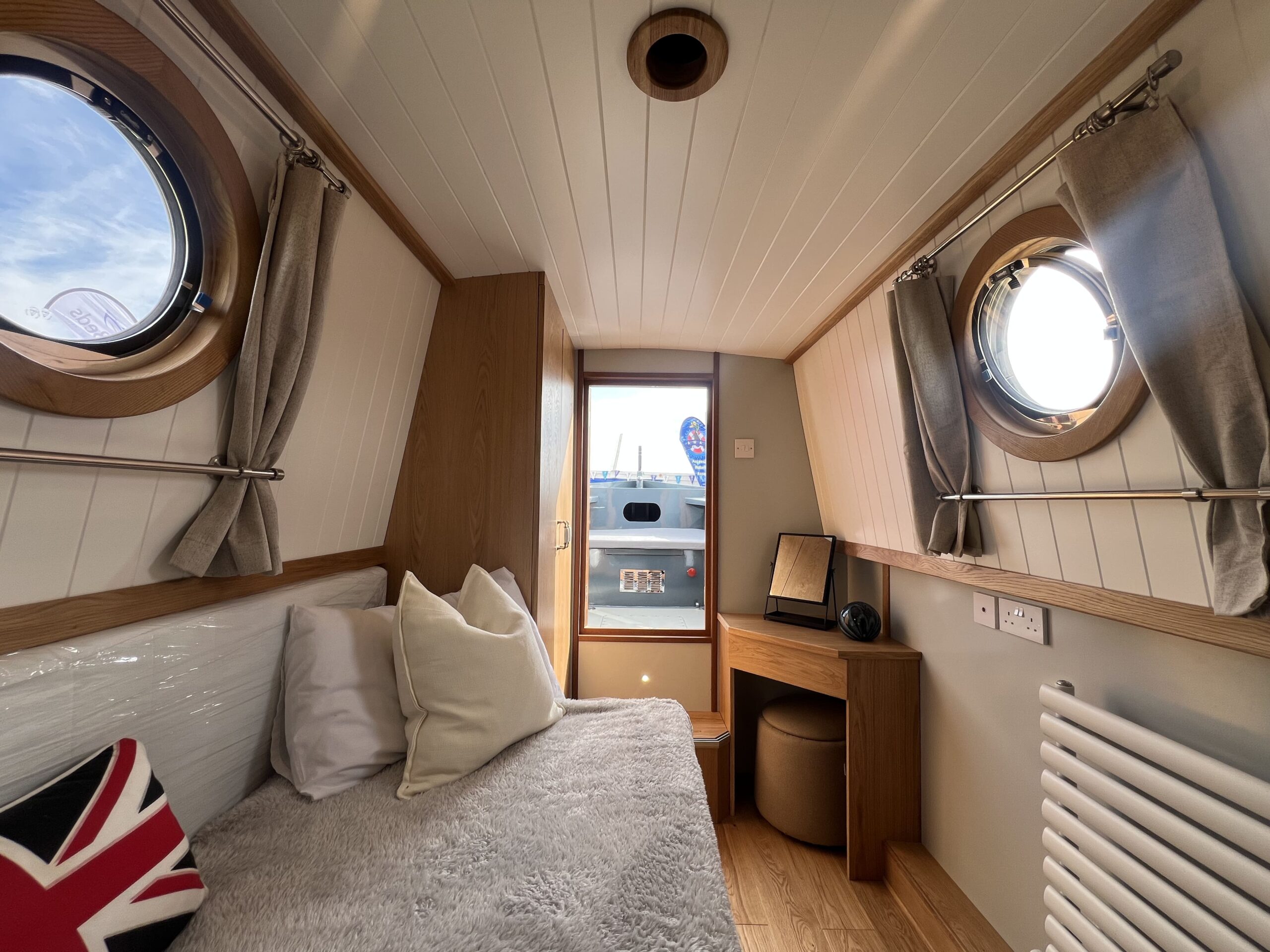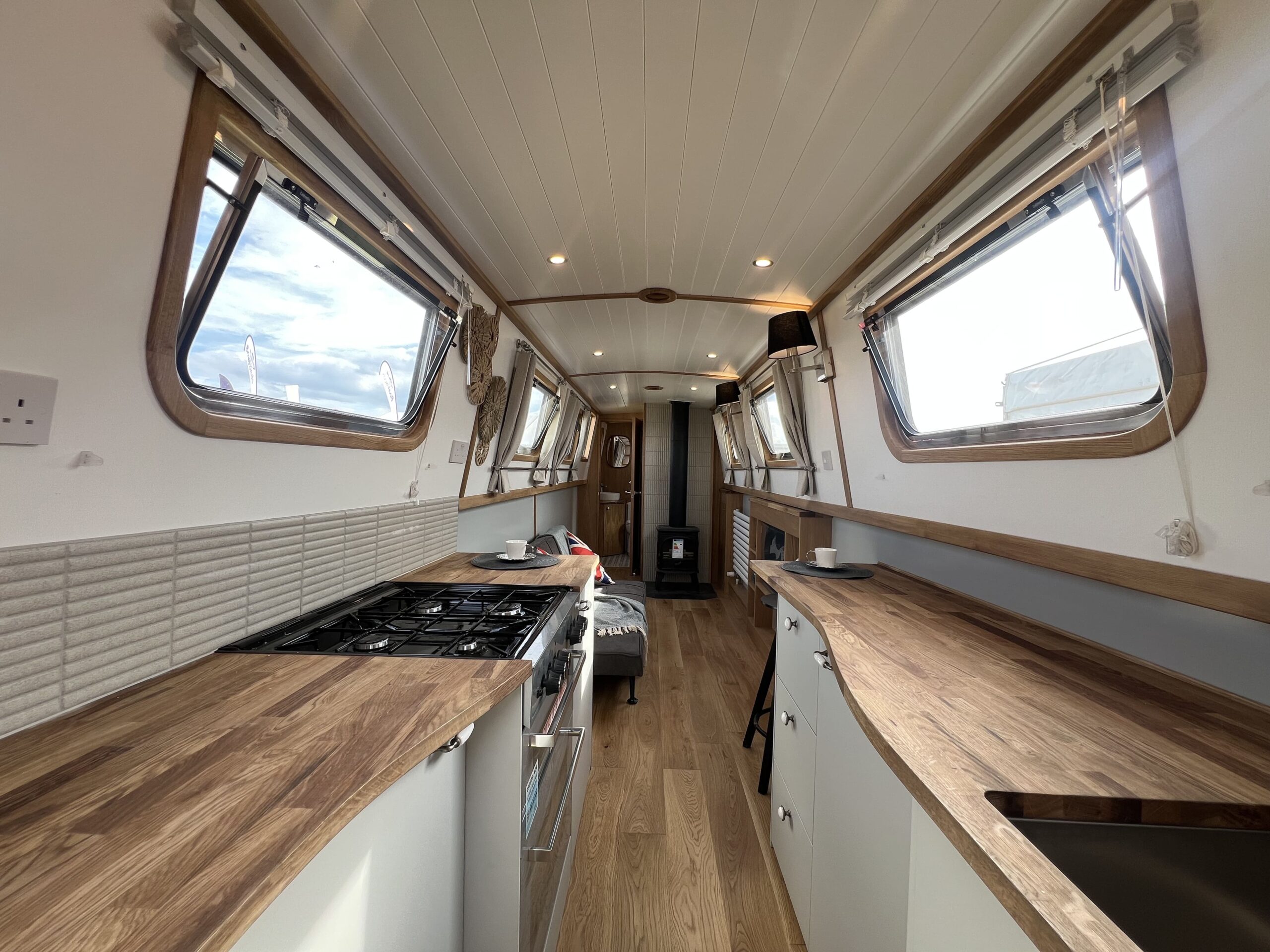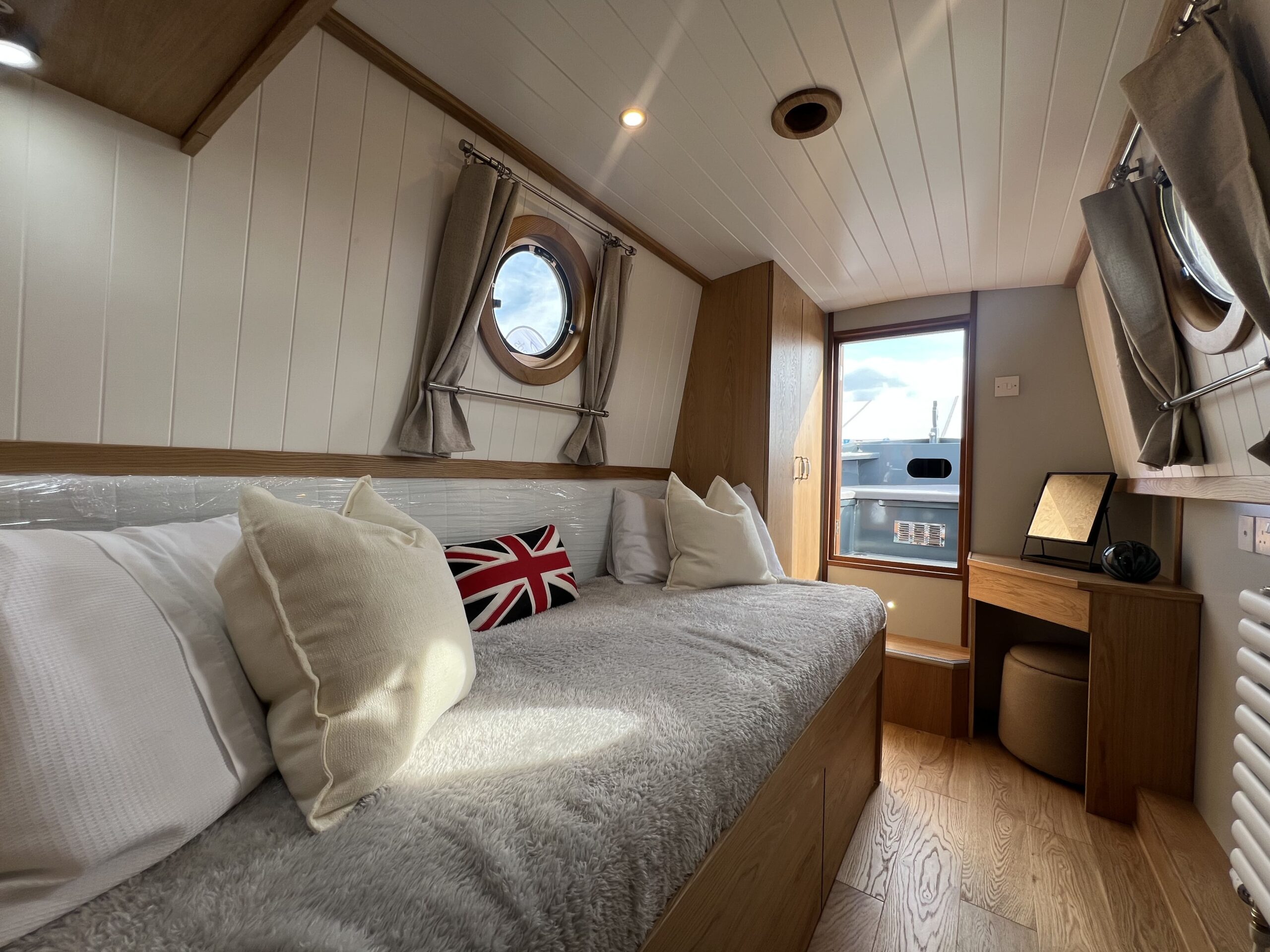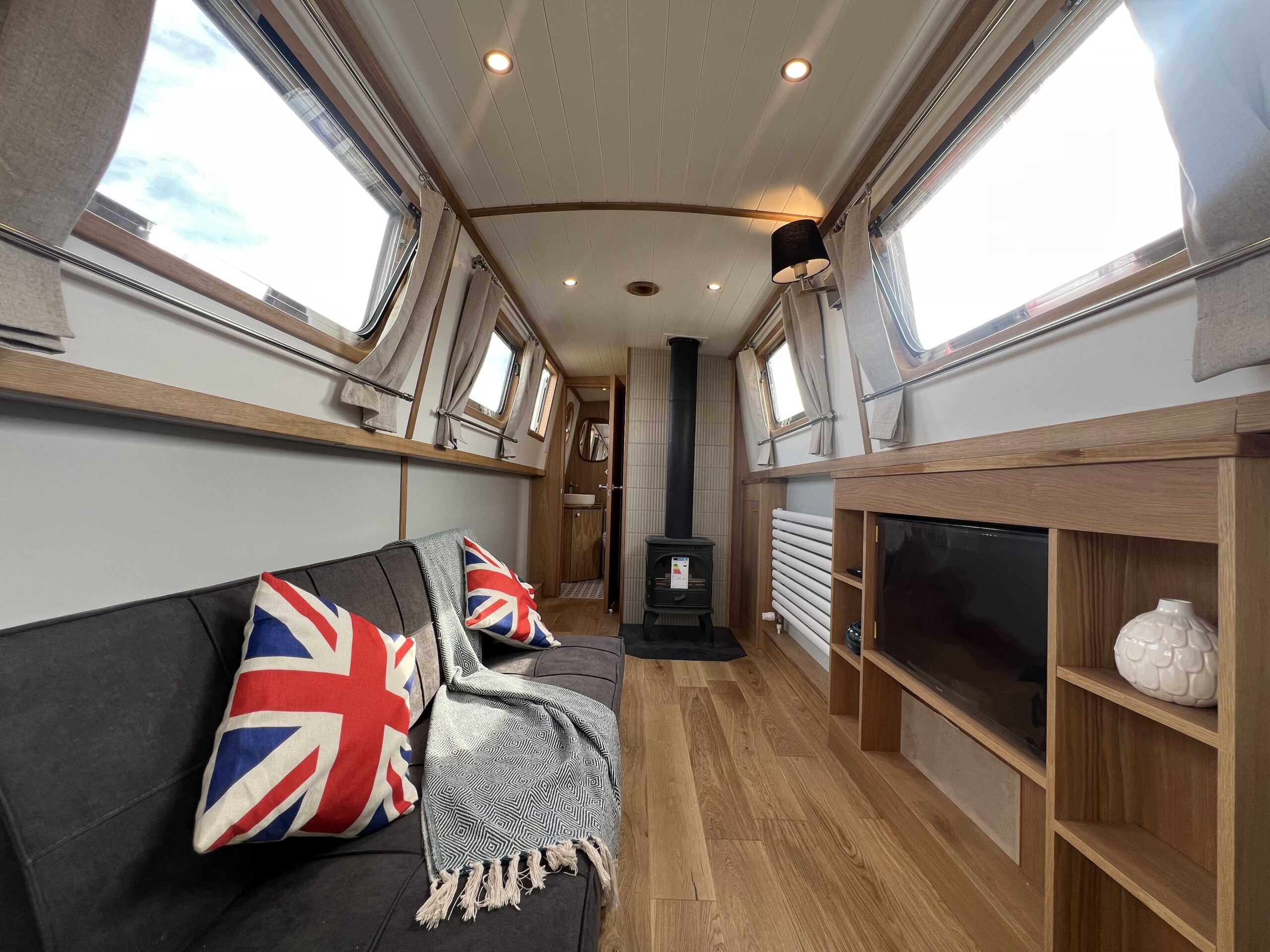 Forward, the ensuite bedroom offers restful nights on the cut, with a Hansgrohe shower and Thetford toilet adding hotel-style convenience.