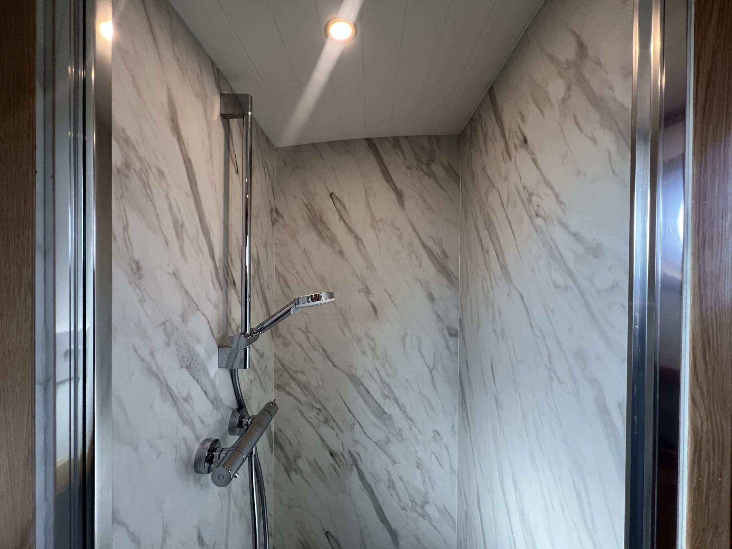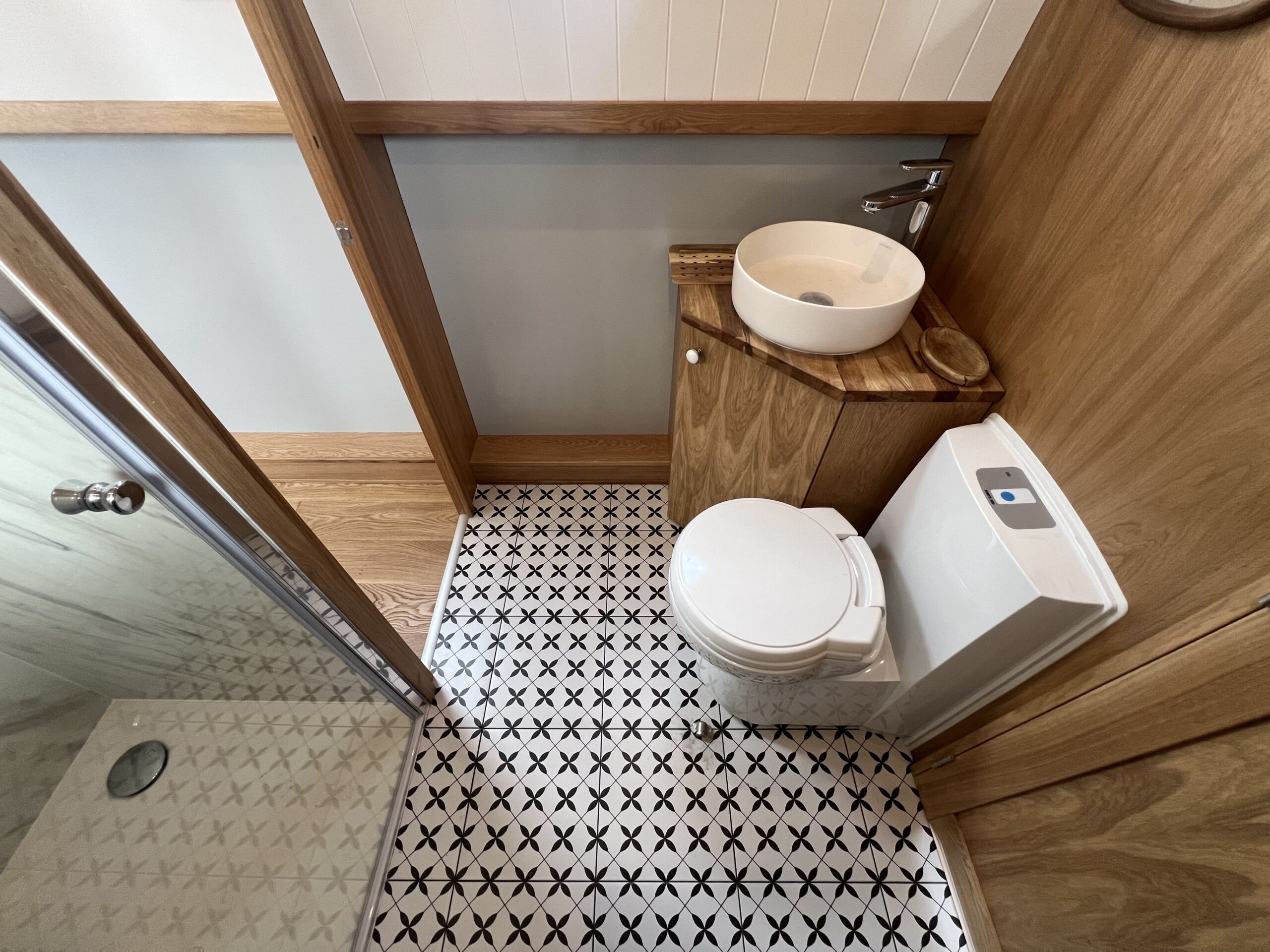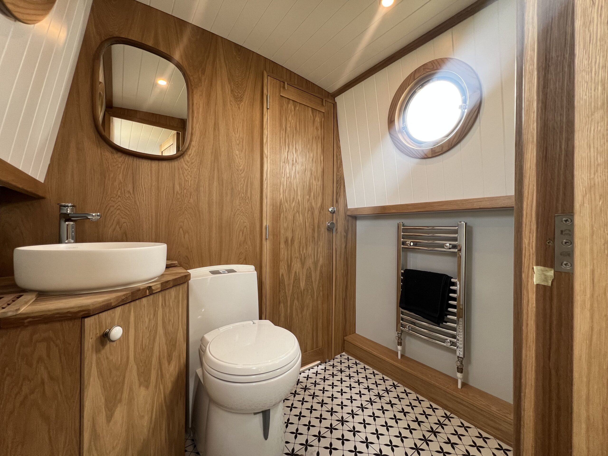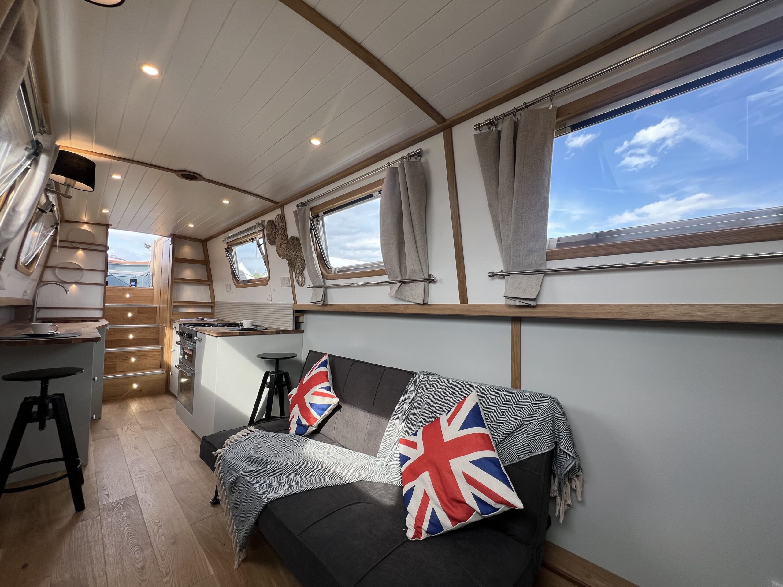 Forward, the ensuite bedroom offers restful nights on the cut, with a Hansgrohe shower and Thetford toilet adding hotel-style convenience.