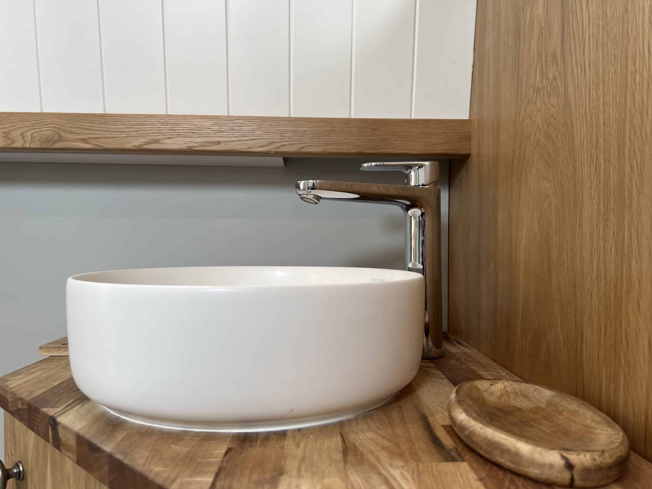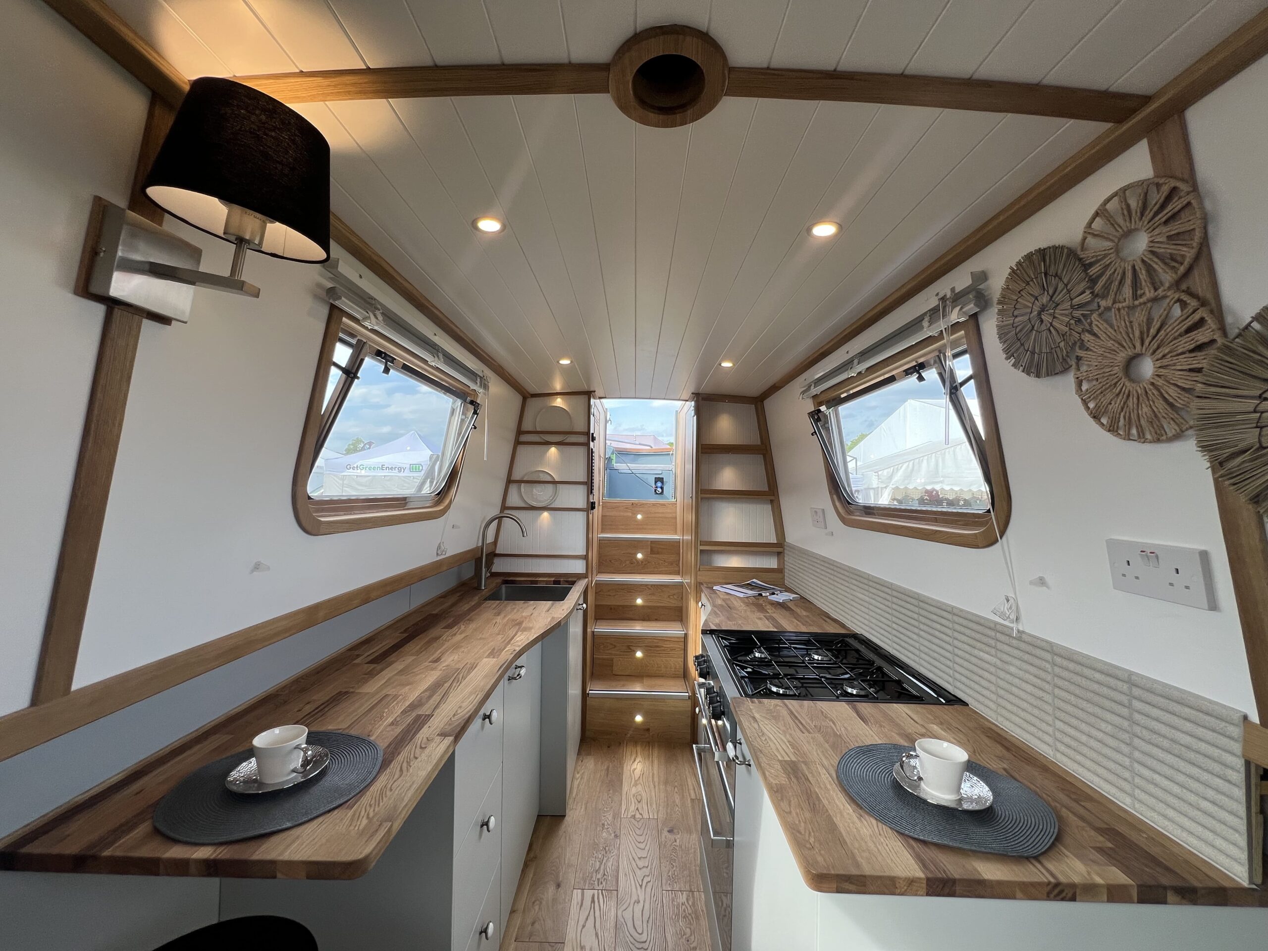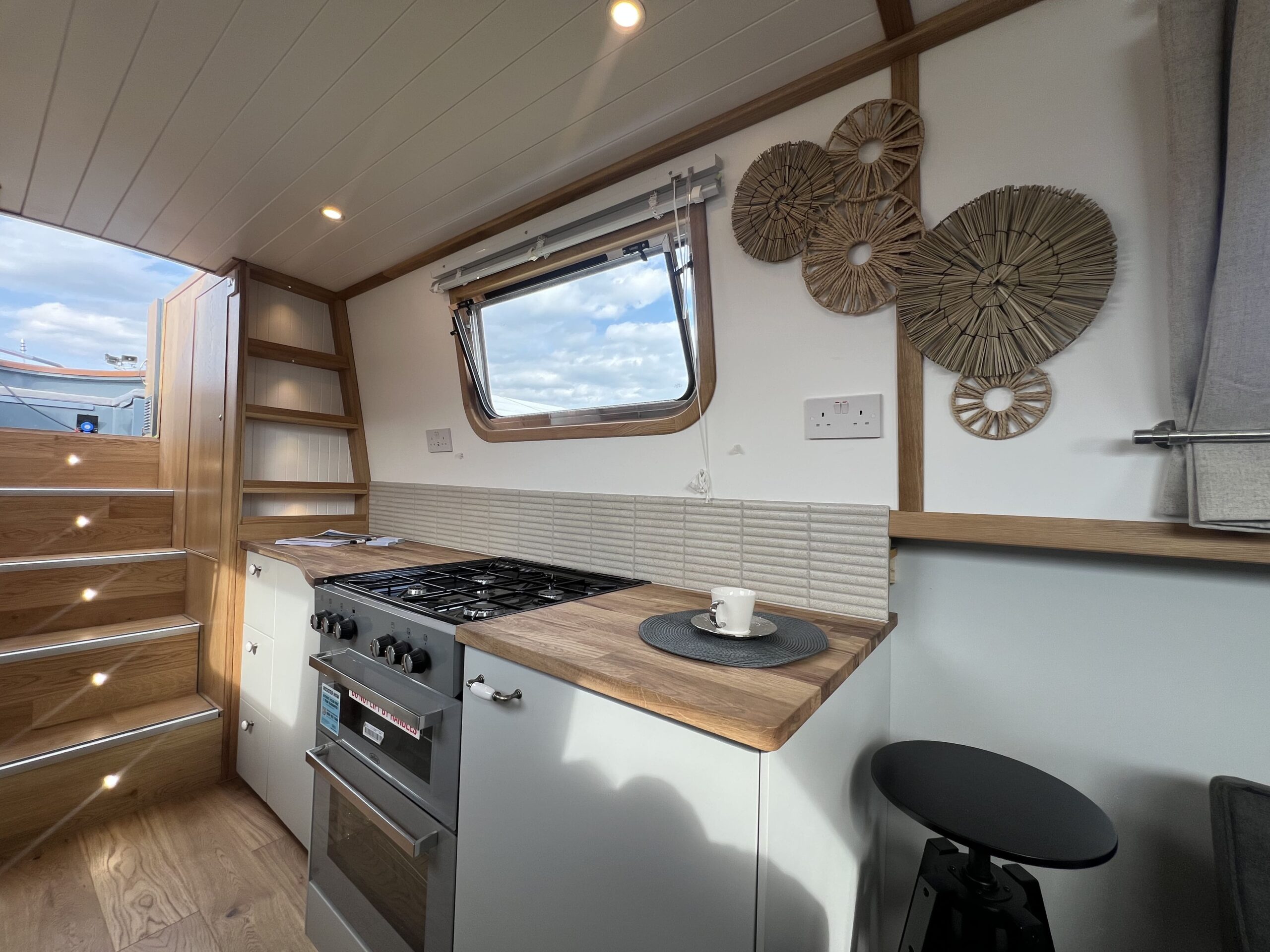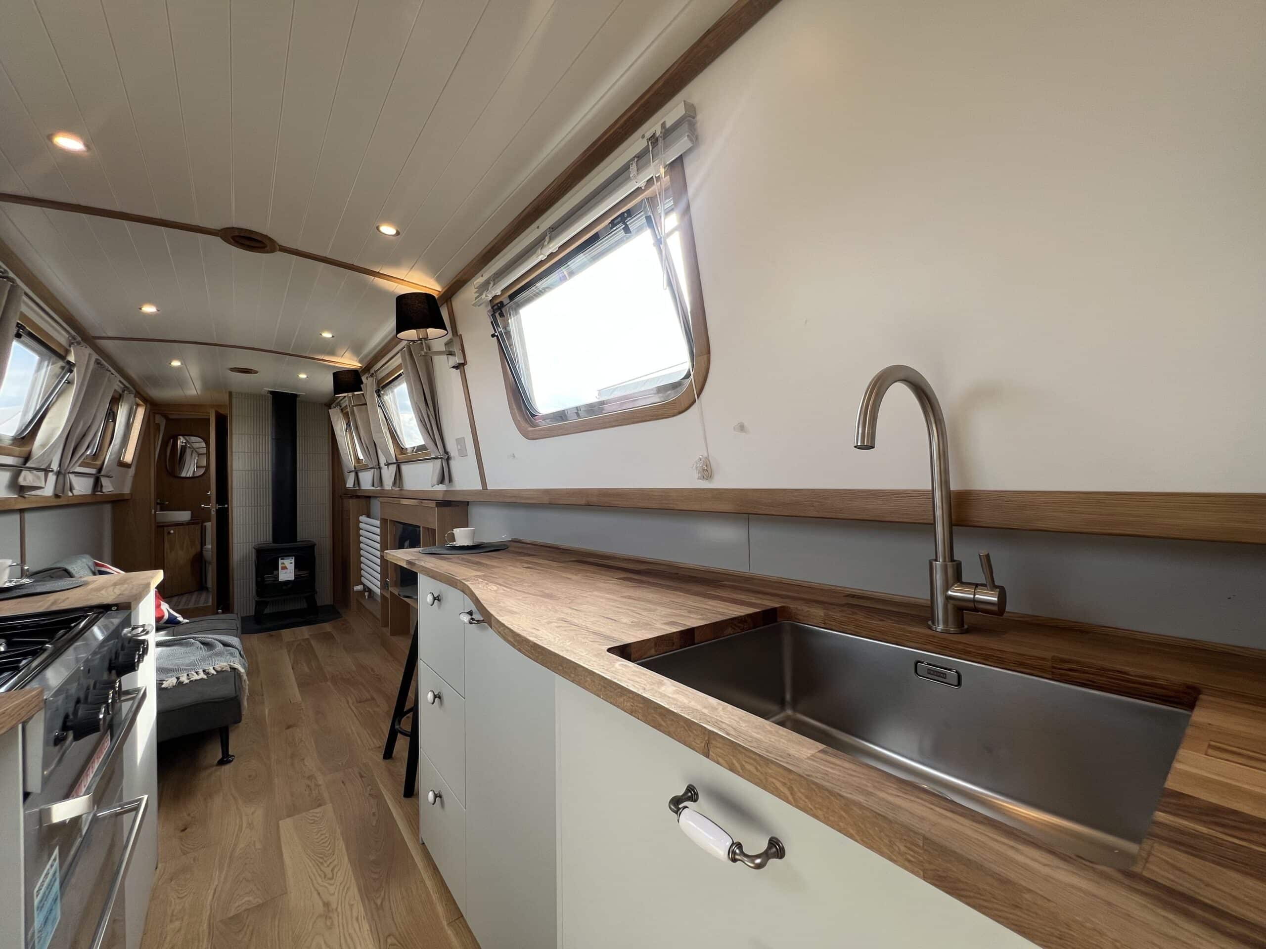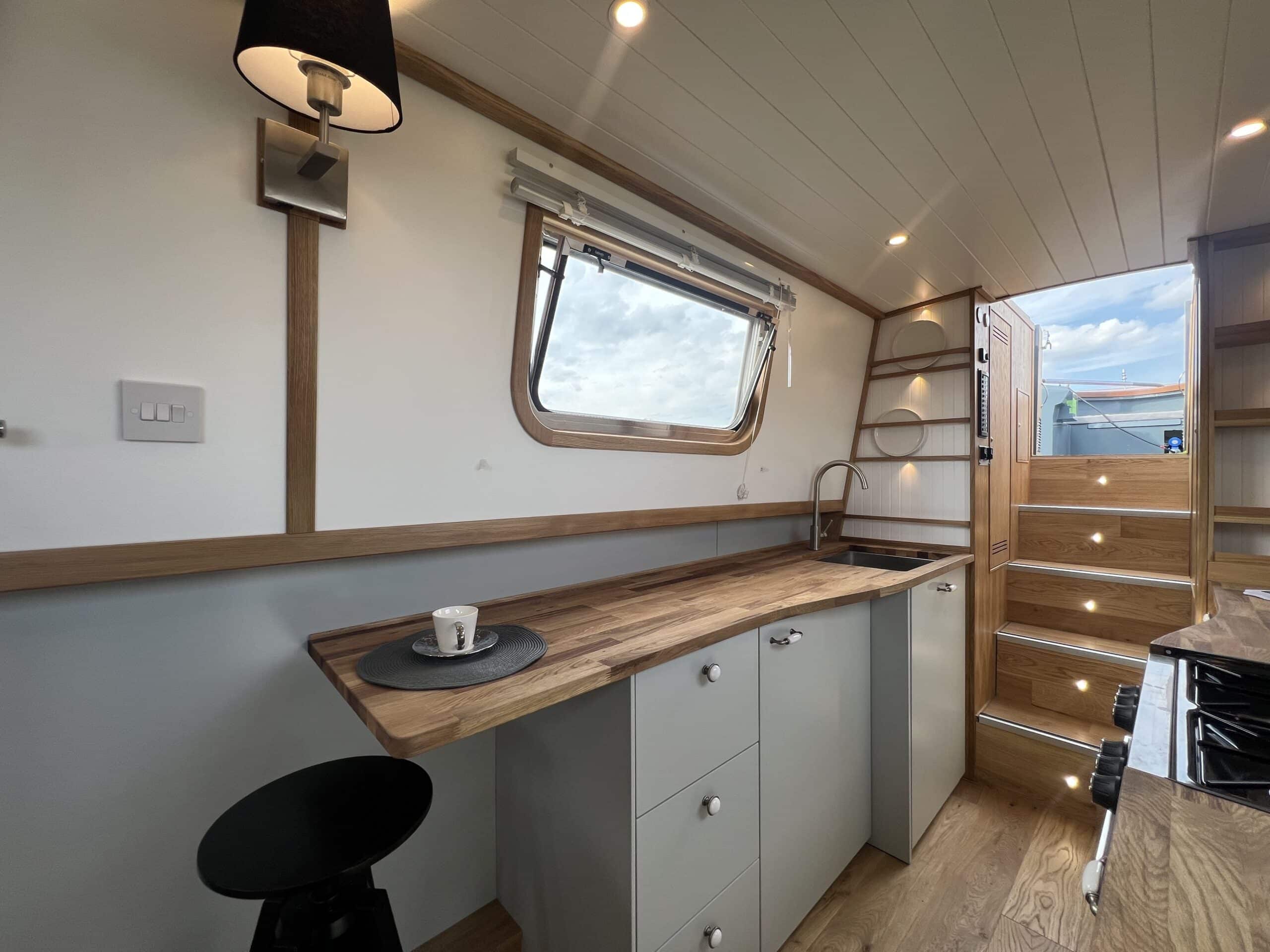 The well-appointed galley features oak worktops, a Beko fridge/freezer, Belling oven and hob, and even a washing machine – perfect for extended stays aboard.