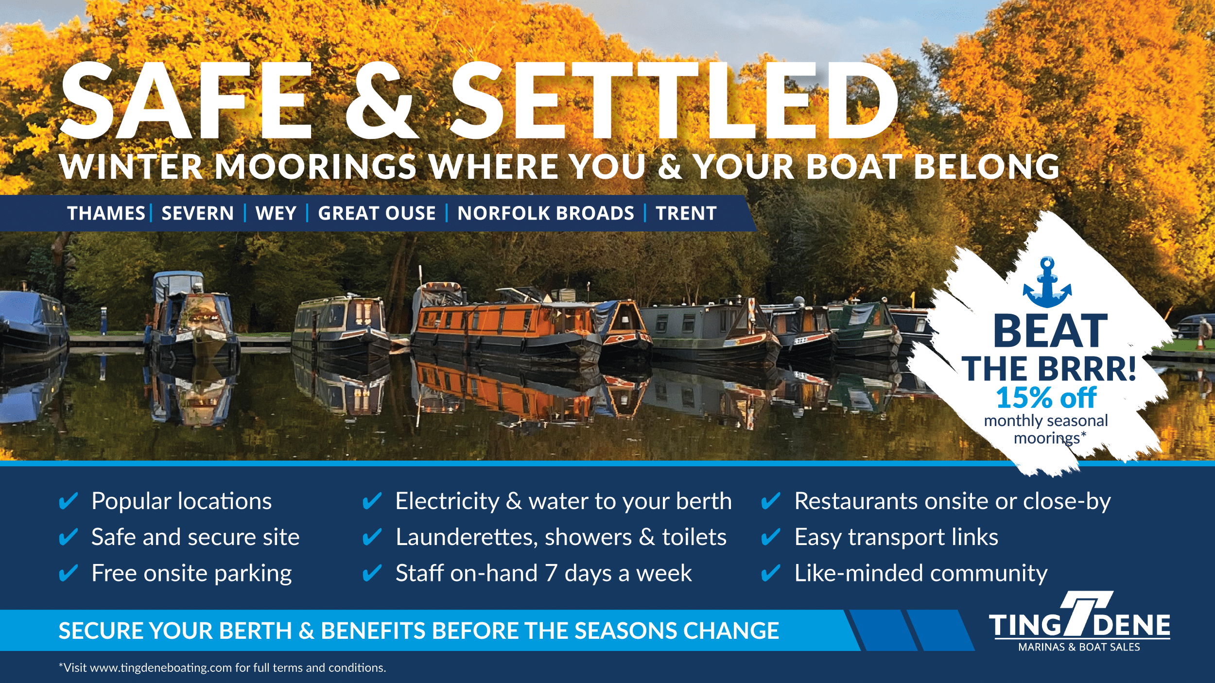 And this year, there’s even more reason to join us: enjoy 15% off seasonal moorings (when paid monthly) from 1st October 2025 to 31st March 2026, across all Tingdene Marinas. This is an offer you (and your boat) won’t want to miss!
